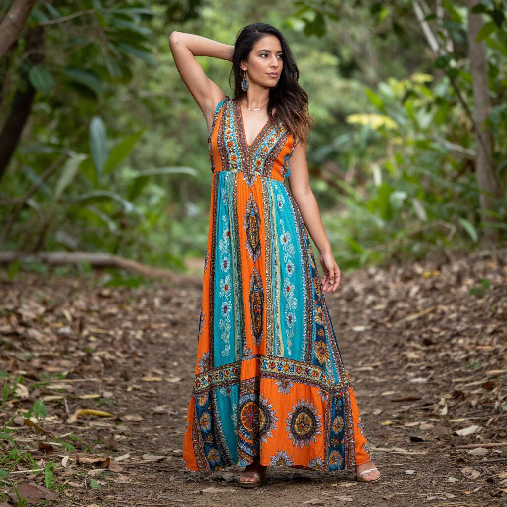 A woman is gracefully posed in a vibrant bohemian-style dress, standing on a leafy path surrounded by lush greenery. The dress features a colorful mix of orange and turquoise fabric with intricate patterns, enhancing the artistic and free-spirited vibe of the setting.