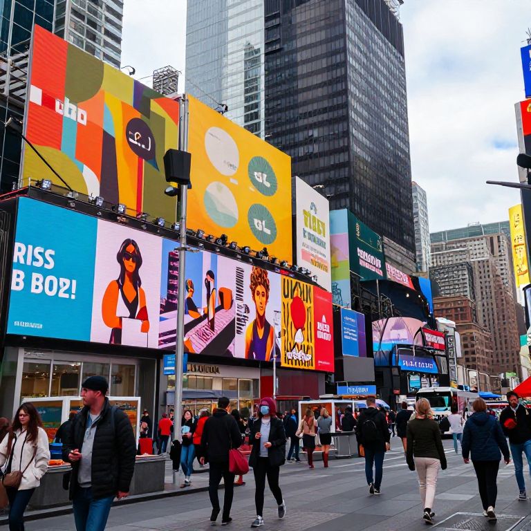 Werbung in a bustling city square, vibrant billboards and posters, dynamic colors and lively crowds, modern urban setting, high detail, photorealistic style with a touch of graphic design art