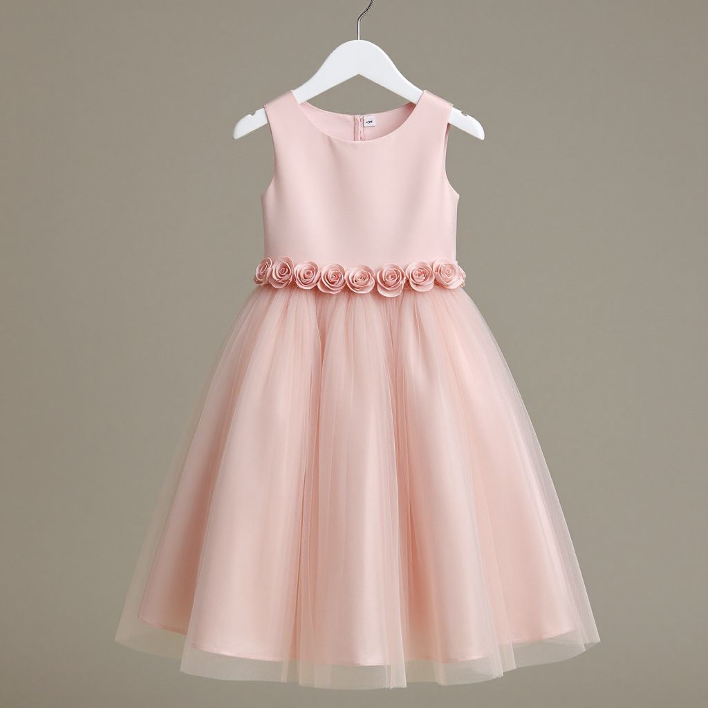 Elegant pink tulle flower girl dress featuring a round neckline, rose embellishments at the bodice, and a flowing A-line silhouette, elegantly displayed on a white hanger against a neutral background.