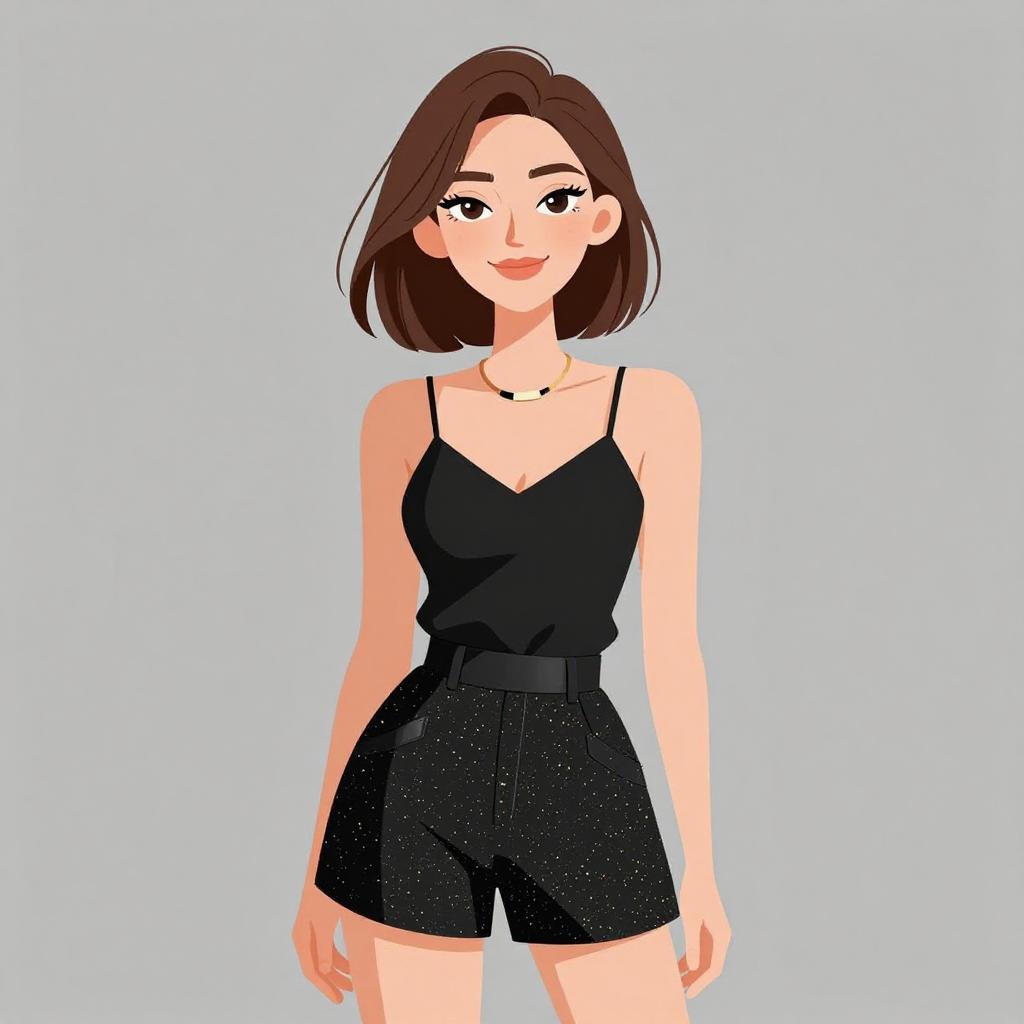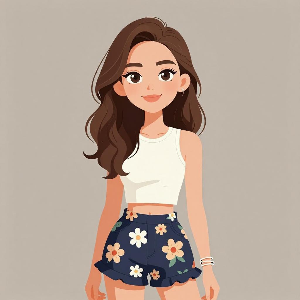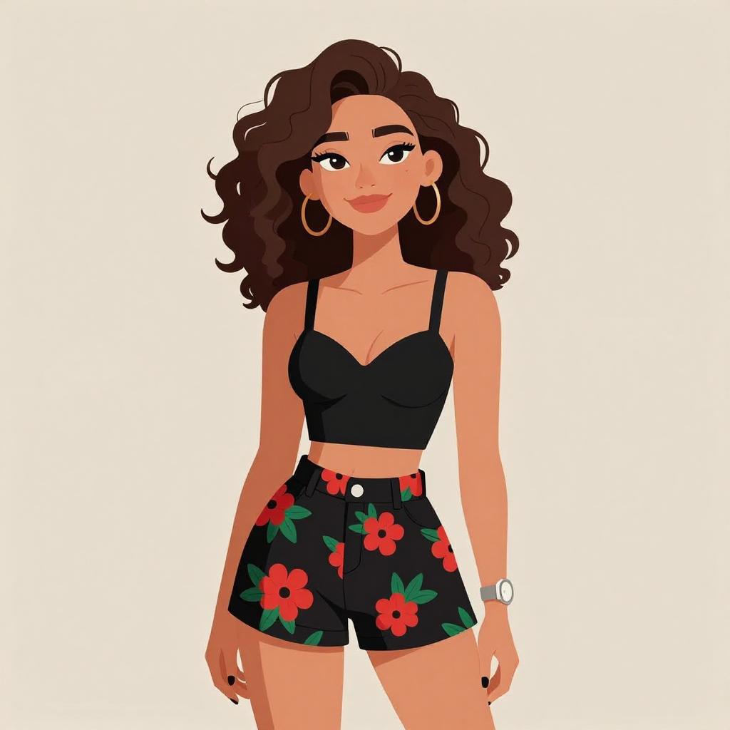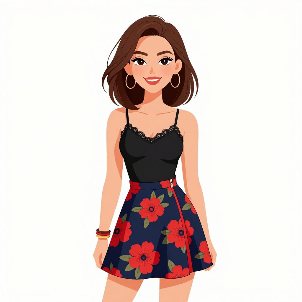 Woman with pretty face and pretty hair. smiling Woman, casual chic, black cropped tank top, spaghetti straps, high-waist flared mini skirt with a red and green floral pattern on a black background, thin gold chain necklace, gold bangle bracelet, white background. --sref 1467