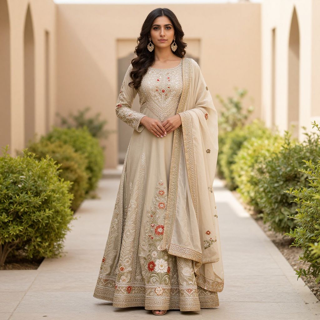 Photograph of an Indian woman with long black hair, wearing a cream-colored, intricately embroidered traditional lehenga and dupatta, standing in a sun