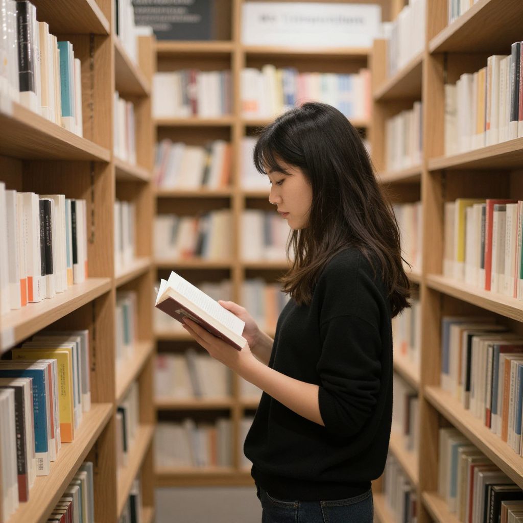 Photograph of an Asian woman with straight black hair, wearing a white t-shirt and blue jeans, reading a book in a wooden library. She has