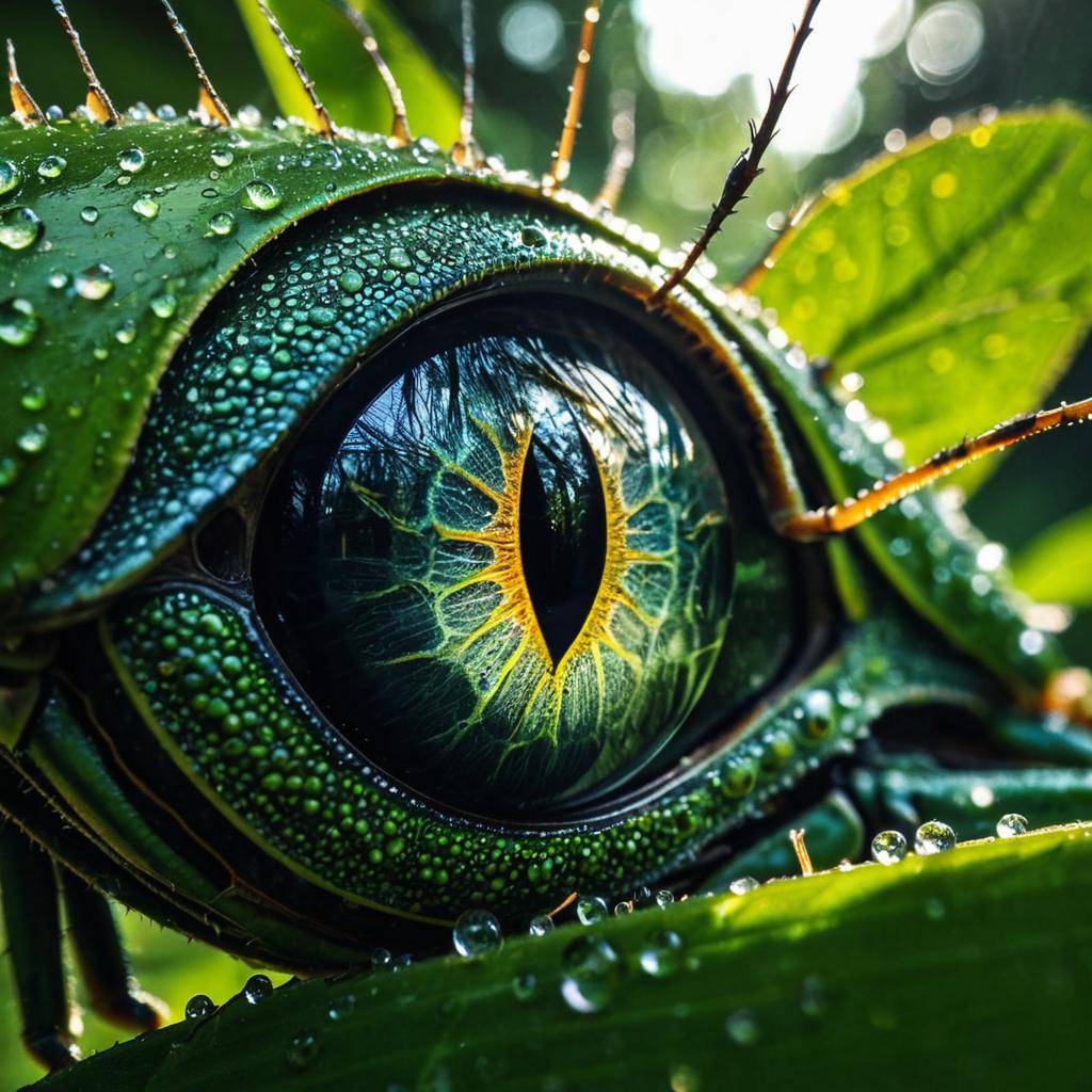 Assemblage a macro photo of a mantis eye in the style of Josh Tep, with intricate details and ultra-realistic qualities. tiny hairs surrounding eye wetted with morning dew, dappled sunlight penetrating foliage. The lighting creates a cinematic effect with epic angle and composition, photorealistic, ultra-HD