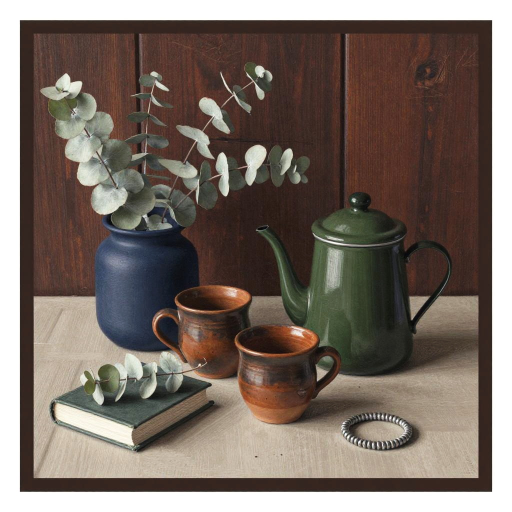 This is a soft charcoal drawing of a decorative still life featuring a matte navy blue pot with sprigs of eucalyptus on the left, two rustic brown stoneware cups in the center, and a glossy dark green enamel coffee pot on the right. A small book and a coiled bracelet sit in front, with gentle highlights and soft shadows to suggest depth. The background is a worn deep mahogany paneled wall, and the whole scene is framed with a dark brown border. Emphasize cozy tones, crisp edges, subtle surface texture, and calm, balanced composition.