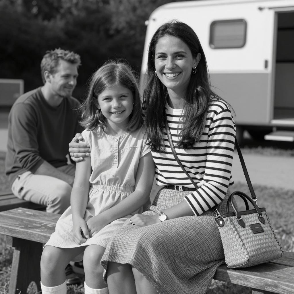 Sepia-toned photograph of a tall adult man and a young boy walking side by side. Man wears a flat cap, plaid shirt, white t-shirt, and jeans, with sneakers. Boy wears a striped shirt, shorts, and sneakers. Both walk towards the camera. Background features a blurred vintage car. Man looks forward, boy looks slightly to the left.