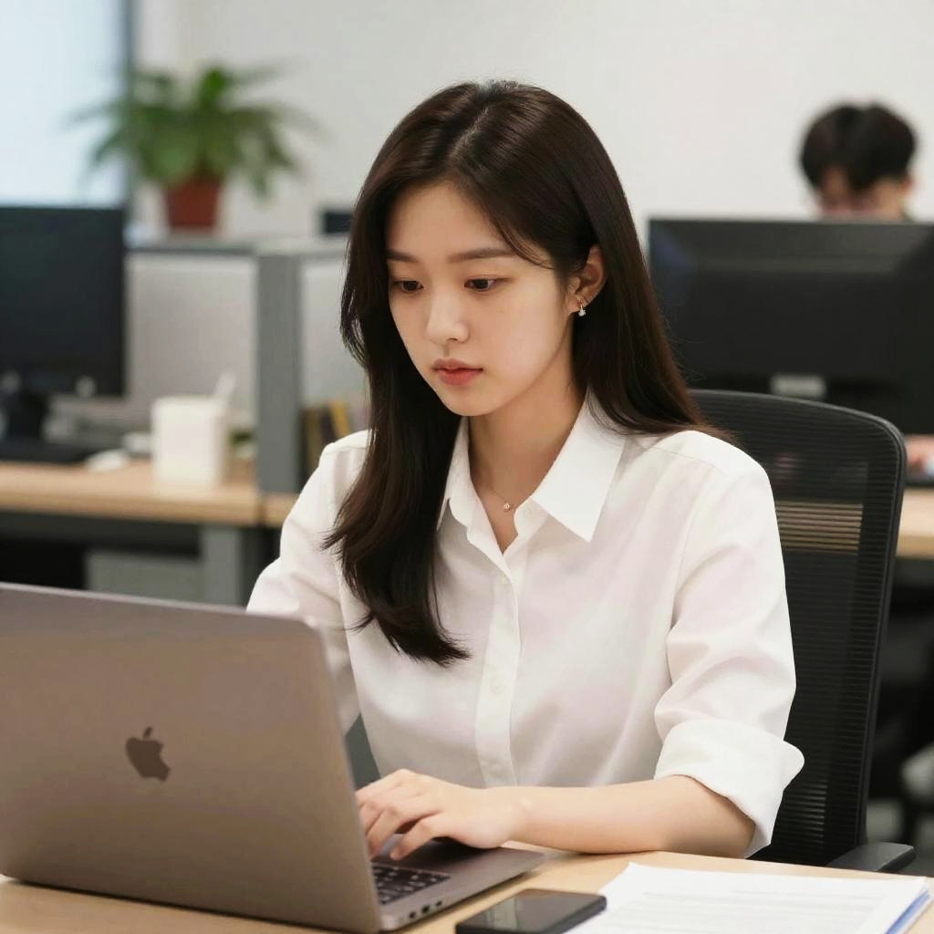 Masterpiece, best quality, photorealistic, ultra highres, blurry background, korean cute girl, office, working