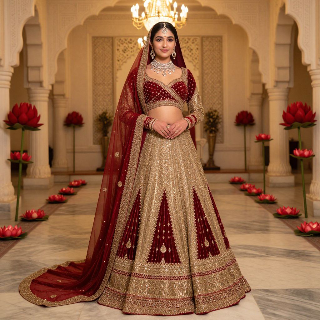 A fashion-forward model in a regal, custom-designed lehenga for her engagement, featuring red velvet accents and a sheer golden train; she has a symmetrical face, fair skin, and a sparkling look with a subtle smile; standing in a heritage wedding venue with traditional red lotus decorations and a backdrop of marble flooring and chandeliers.