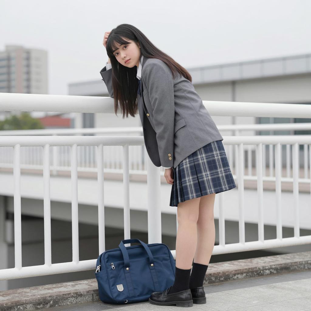 Anime-style photograph of a young woman with short black hair, wearing a dark gray coat, white scarf, blue skirt, white socks, and black loafers, stepping off a silver train with green and blue stripes. Snow is falling. She is looking down and slightly to the side. The train door is open, and she carries a dark blue bag over her right shoulder. The platform is covered in snow. The train has a visible CJS Japan on the side.