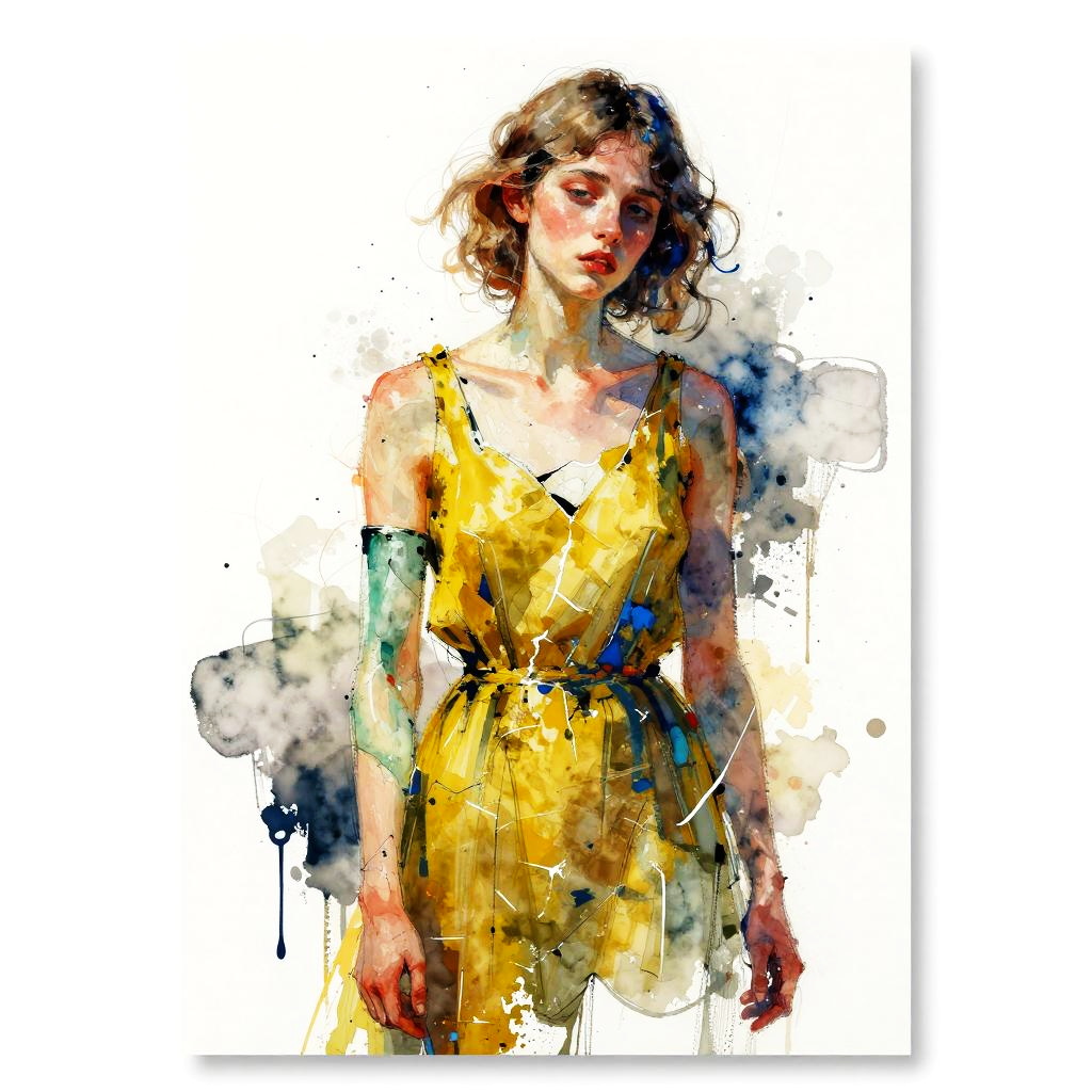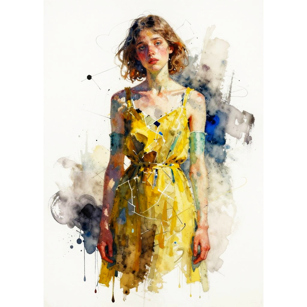 Expressionist semi-abstract portrait of shattered young woman clad in moss-yellow dress with abstract jade limbs, rendered in neo-expressionist watercolor and ink blending with tonal splashes and irregular washes, high-contrast bold colors, loose gestural strokes and textured paint ridges, minimal white negative space with asymmetrical crop, cobalt-shadow accents and suggestive contours, emotive wistful energy laced with quiet despair, contemporary art poster vibe, painterly chaos with subtle drips, unresolved edges, luminous highlights.