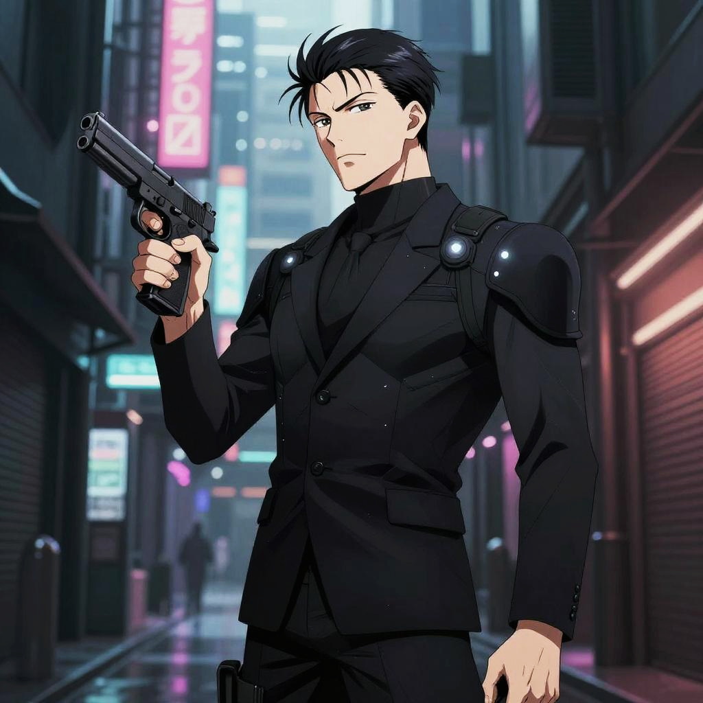 A cunning spy, wearing sleek black suit interwoven with light armor plates, wielding a silenced pistol with micro blades, in a dimly-lit high-tech city alley full of neon reflections, drawn in the dark and stylish anime style of Kouta Hirano.