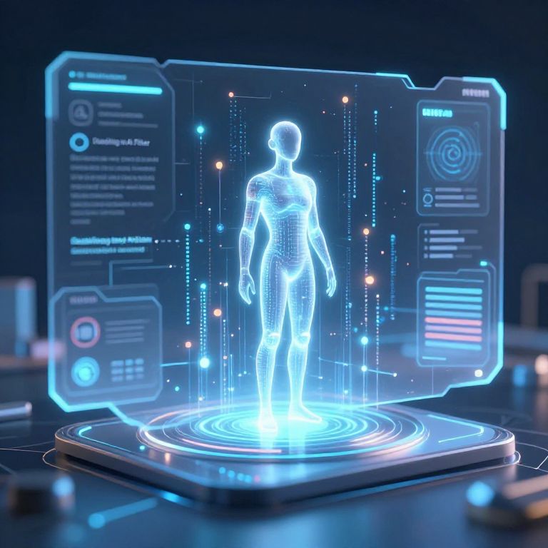 Digital CGI of a glowing, neon-blue, wireframe human figure standing on a futuristic holographic platform with cybernetic interface screens.