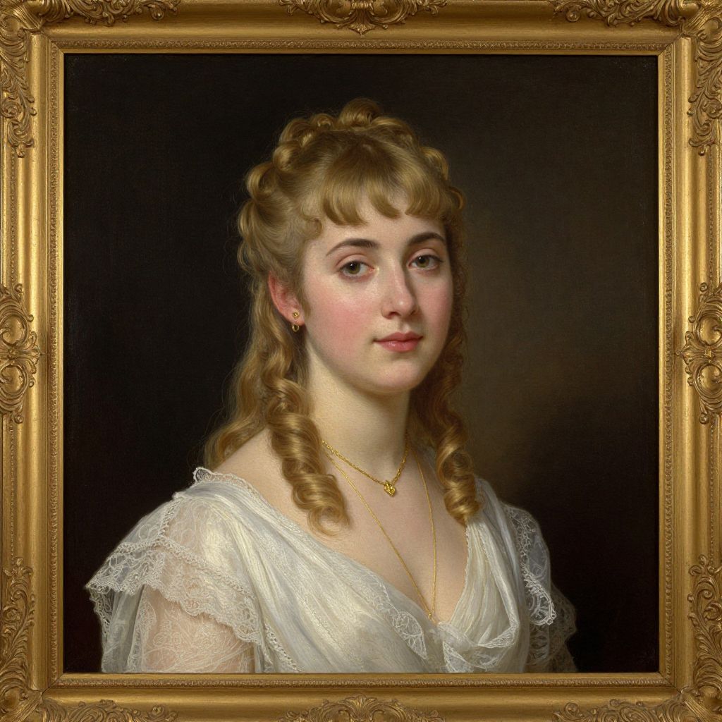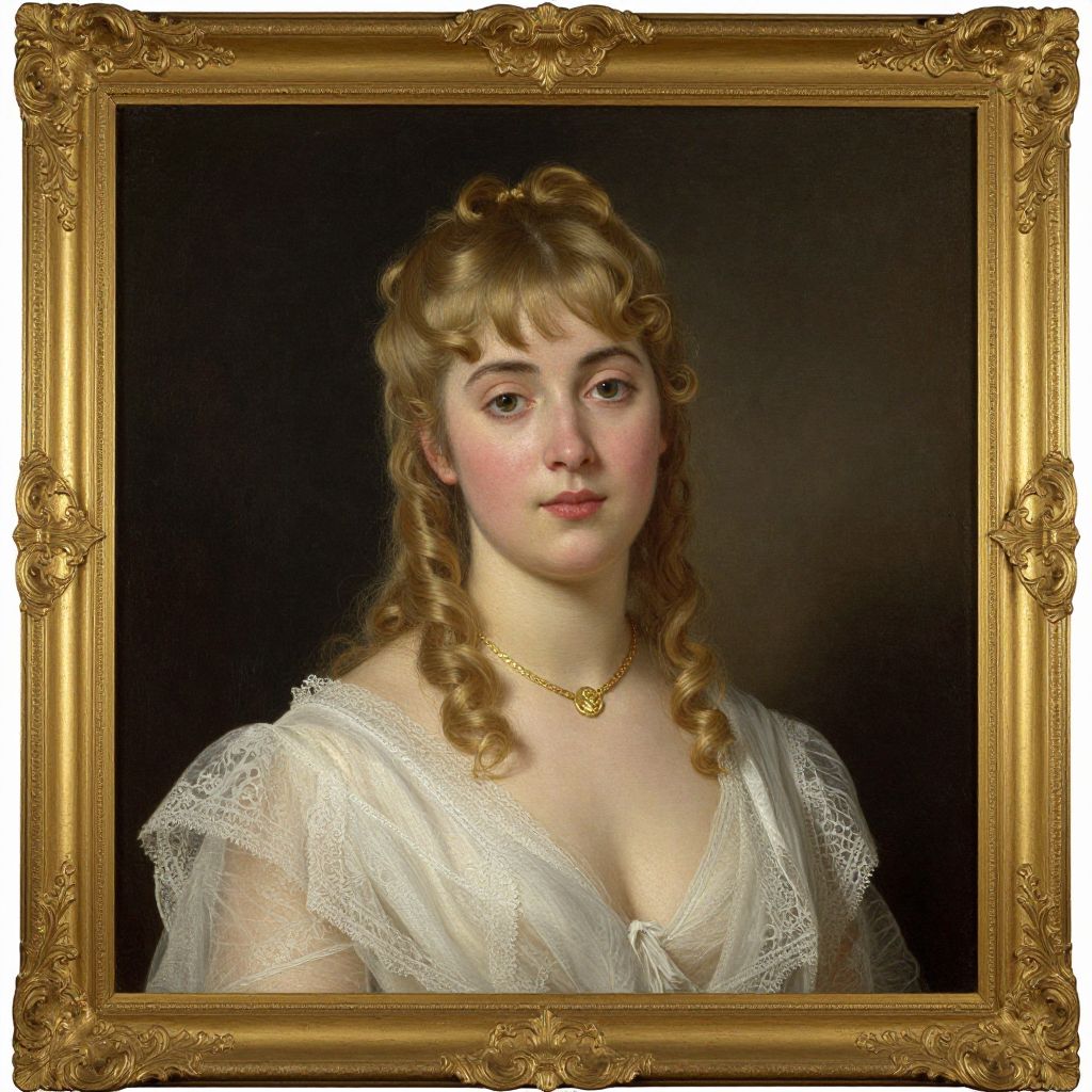 Photorealistic portrait of a young Caucasian woman with curly brown hair, wearing a white lace dress and gold necklace, framed in an ornate gold frame