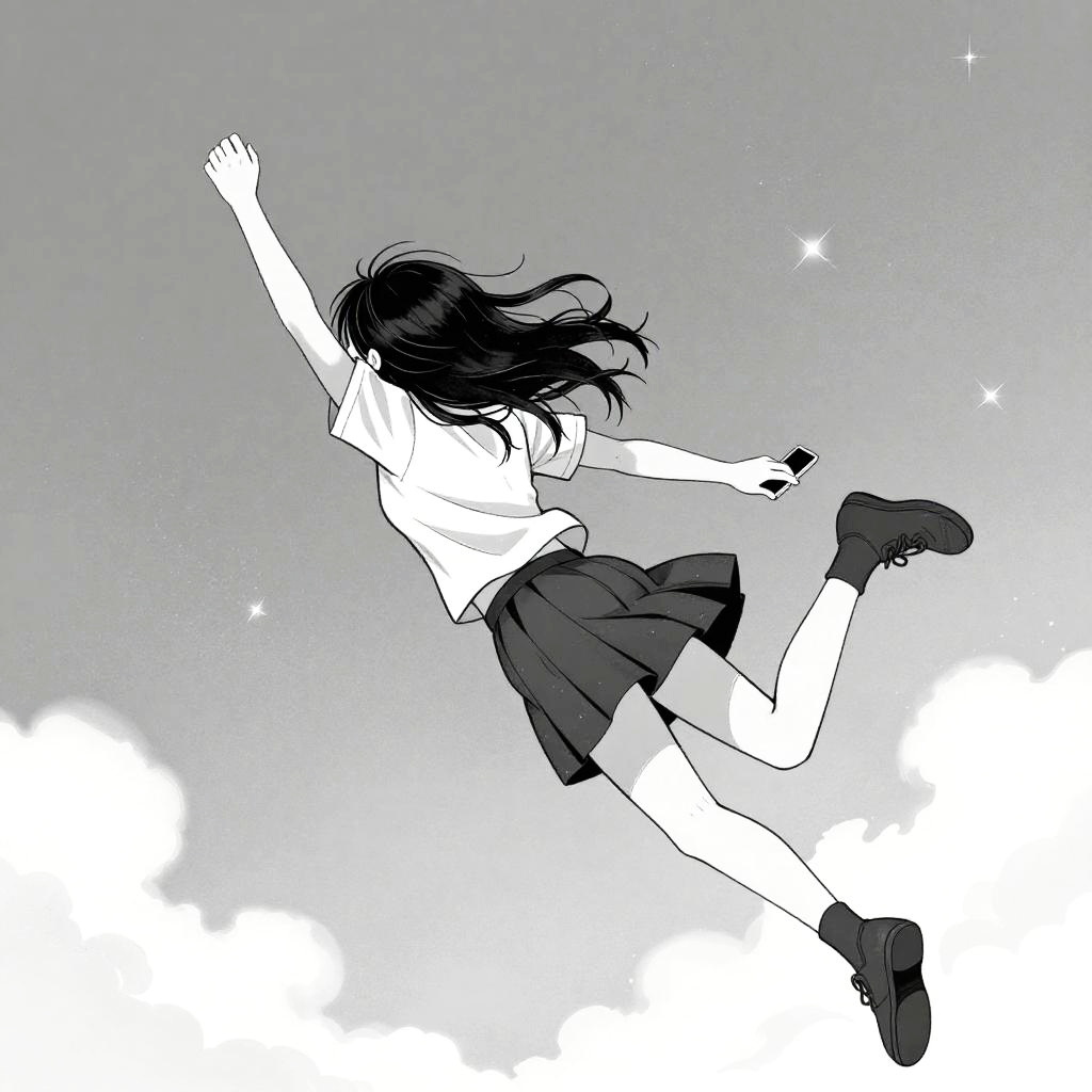 A colorful digital drawing of a person with short brown hair, wearing a yellow shirt and purple pants, falling upside down against a bright blue sky with fluffy white clouds. Their arms and legs are spread out, and small yellow and pink flowers float around. The bottom edge has some green grass tufts, adding a touch of earthiness to the scene.