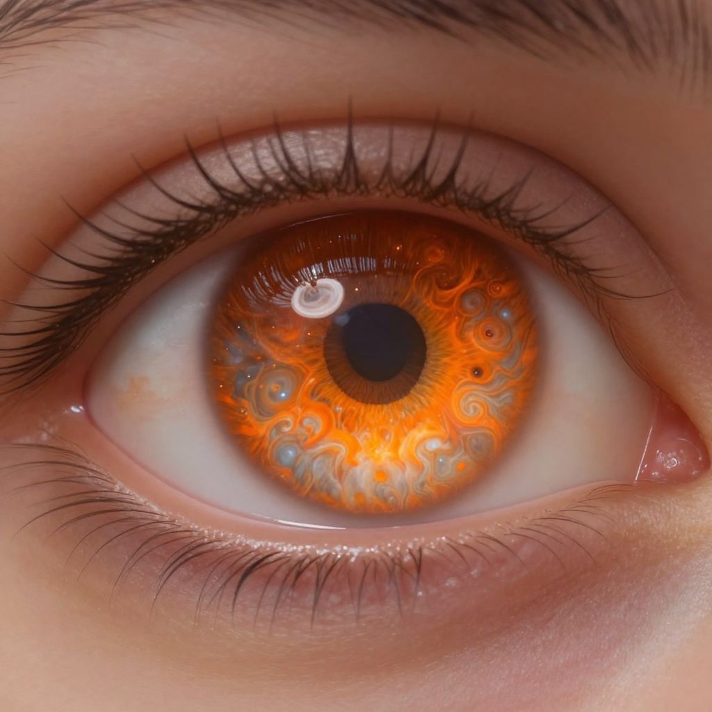 A hyper-realistic digital illustration captures a mesmerizing close-up of a human eye, where the iris glows with radiant orange hues and intricate concentric patterns resembling a cosmic microcosm, complete with swirling galaxies and black hole-like voids, all rendered in stunning high-definition detail.