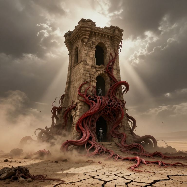 A crumbling, gothic stone tower rises amidst a desolate wasteland, its weathered bricks eroded by time and the scorching desert winds, The structure twists unnaturally, as if resisting collapse, its shadow casting jagged shapes across the cracked ground below, Twisting, pulsating red tendrils sprawl from a grotesque pit of writhing organic matter beside the tower, creeping upward and embedding themselves into its walls, overtaking it with sinister intent, The air is thick with tension, the sky above a bleak, overcast swirl of ash-grey and muted yellow hues, and faint, eerie whispers seem to emanate from the grotesque mass, Within the tower’s open arches, a lone figure stands, clad in battle-worn armor, surveying the monstrous sight, Dust billows in the air, illuminated by thin beams of sunlight breaking through the stormy clouds, casting an ominous glow on the crimson infestation below, This is a place of decay and corruption, a cursed stronghold trapped in a perpetual struggle between ruin and rebirth, where the land itself seems alive with malicious intent