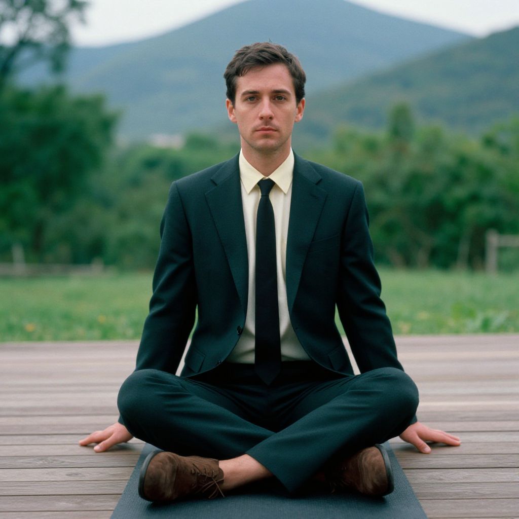A man, dark green suit, ivory dress shirt, slim black tie, suede derby shoes, lightweight wool material, open-air yoga deck, lush greenery, tranquil mountain backdrop, kodachrome analog film, relaxed expression, serene atmosphere. Man has masculine face and piercing eyes