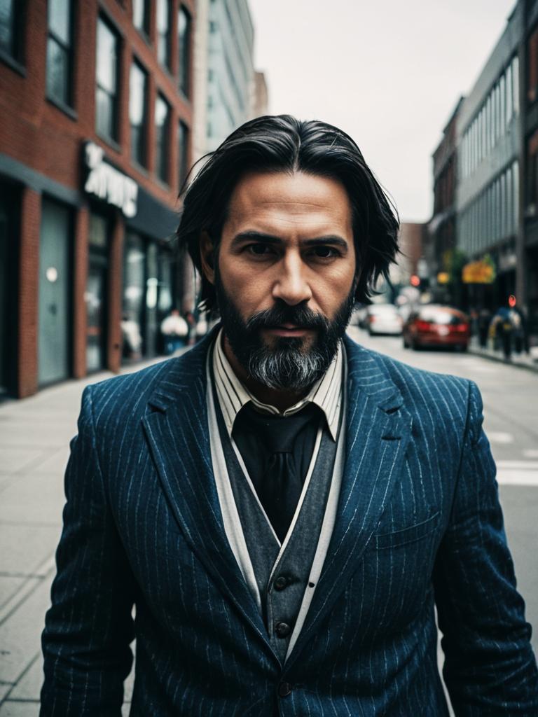 Portrait of a middle-aged man wearing a dark, dramatic coat with leather gloves, a gray pinstripe vest, white shirt, and striped tie. The man has slicked-back gray hair and a serious expression, posing against a tiled urban wall background. The cosplay is inspired by the character Anya Forger, represented in a cinematic and realistic style.