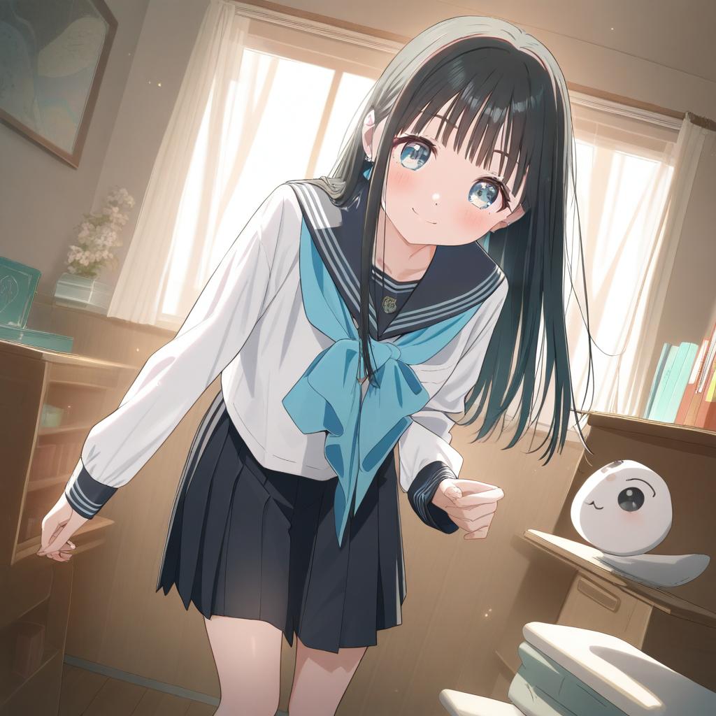 Anime-style illustration of a girl with long black hair and blue eyes wearing a traditional Japanese sailor-style school uniform. The outfit features a white long-sleeve shirt with a black sailor collar, a blue necktie, and a pleated black skirt. The girl is standing indoors with sunlight streaming through large windows in the background. The scene also includes a small round plush toy on a desk nearby.