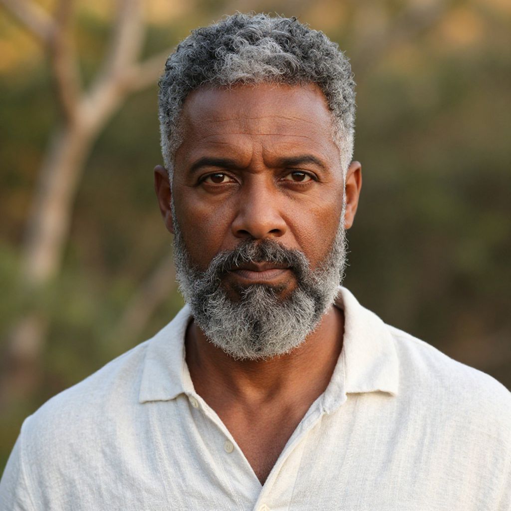 Portrait of a grey hair handsome salt and pepper beard black man, mid-40s, with intense eyes and a distinguished look, dressed in casual linen shirt, outdoor garden setting with warm golden hour light, highly detailed facial features and textured beard.