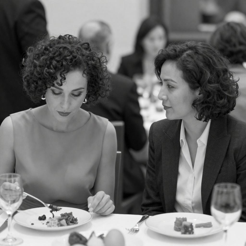 Black-and-white photograph of two women at a table. One woman with dark hair in a braid, wearing a long-sleeve top, holds a fork while the other woman with curly hair in an updo, wearing a collared top, reaches for food. Table has dishes, a plate, and a typewriter. Both women look at each other. Background includes a bench and curtains.