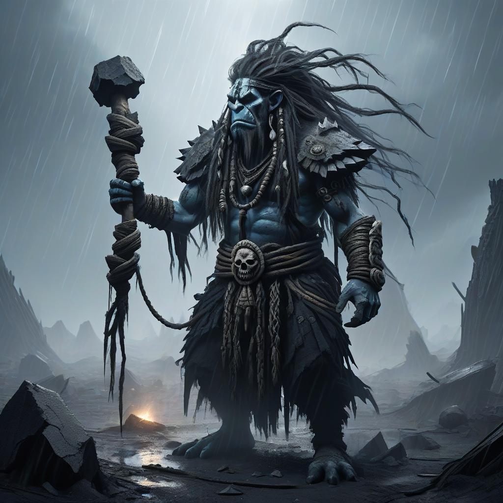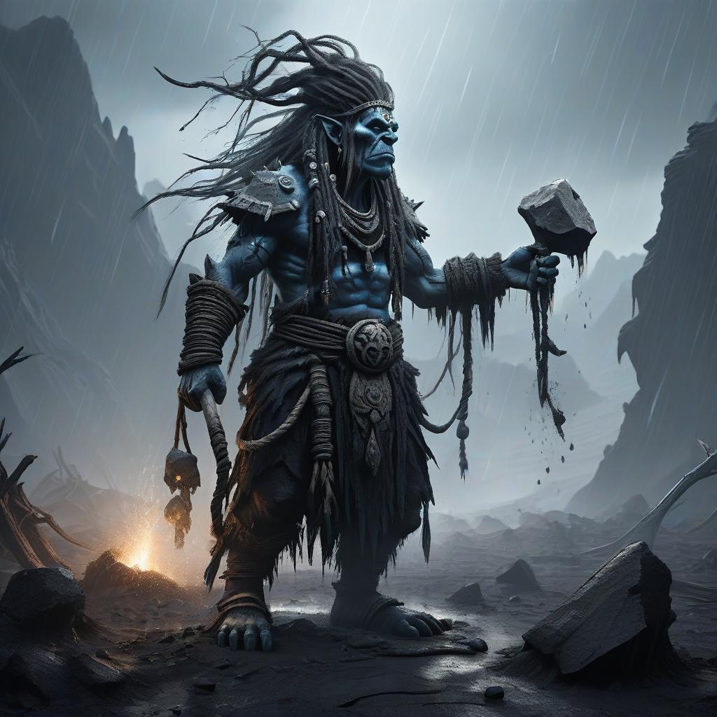 A troll shaman casting a rain of obsidian shards, in a desolate wasteland covered in ash, with thick ropes of braided hair and a massive bone totem, foreboding and eerie, dramatic lighting and highly textured
