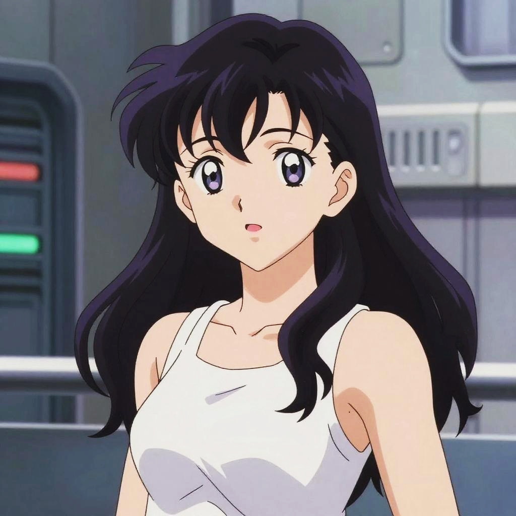 A reflective portrait of Misato age in her early thirties, anime character, expressive eyes, warm color palette, futuristic military setting with soft shadows