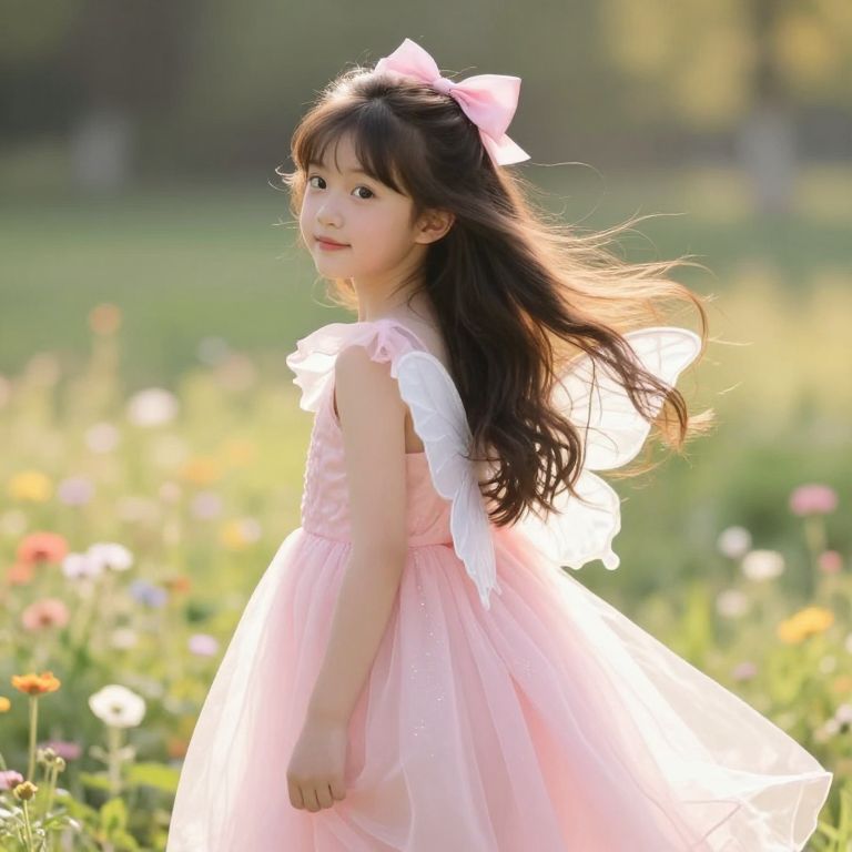 A beautiful young girl with soft, glowing angel wings made of delicate white feathers that shimmer in the sunlight, standing in a peaceful meadow surrounded by blooming flowers. She wears a delicate flower crown made of fresh, vibrant blossoms, including roses, daisies, and lavender, gently resting on her hair. Her eyes are warm and expressive, with a gentle smile, and her skin has a natural, ethereal glow. She looks serene and joyful, as if in harmony with nature and the divine, in a dreamlike, fantasy setting with soft pastel skies and gentle breezes.