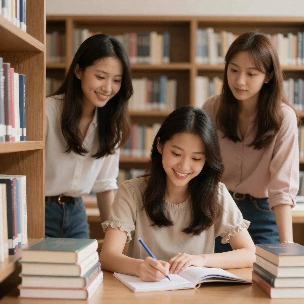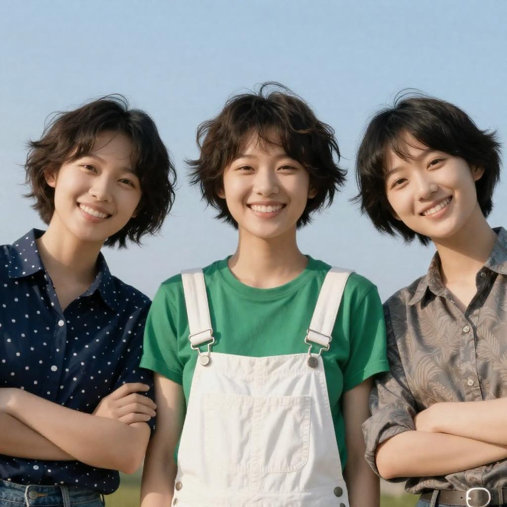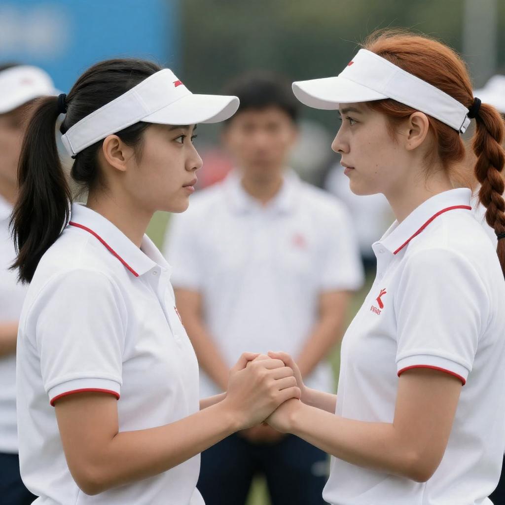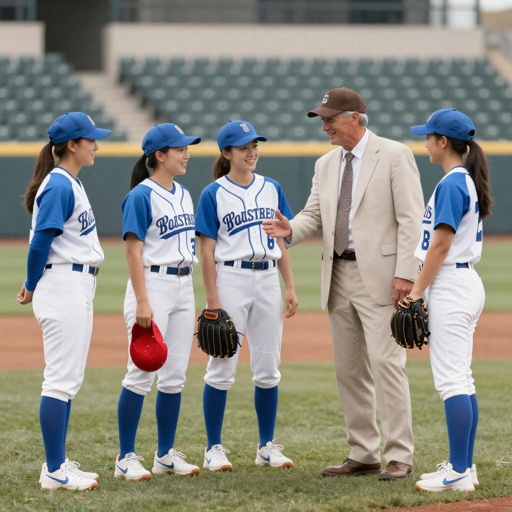 Photograph of three women in a baseball stadium. Two women on the right, one with a red cap and brown vest, one with a red cap and white shirt, smiling and shaking hands. One woman on the left with brown hair and yellow shirt smiling at them. Background includes blurred crowd and baseball field.
