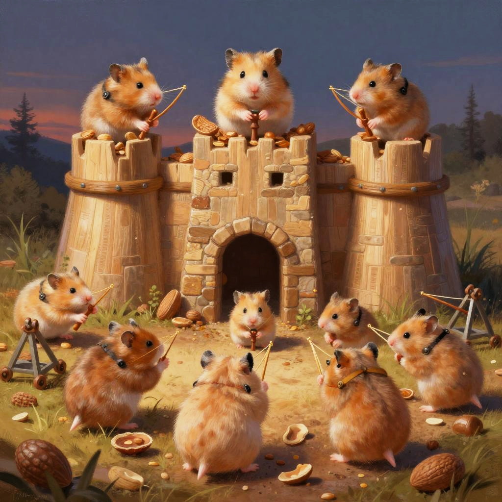 Hamster army defending their fortress made of nuts and wood, under a twilight sky, hamsters equipped with slingshots and tiny catapults, cozy yet intense atmosphere, painterly style with warm color palette and attention to small details.