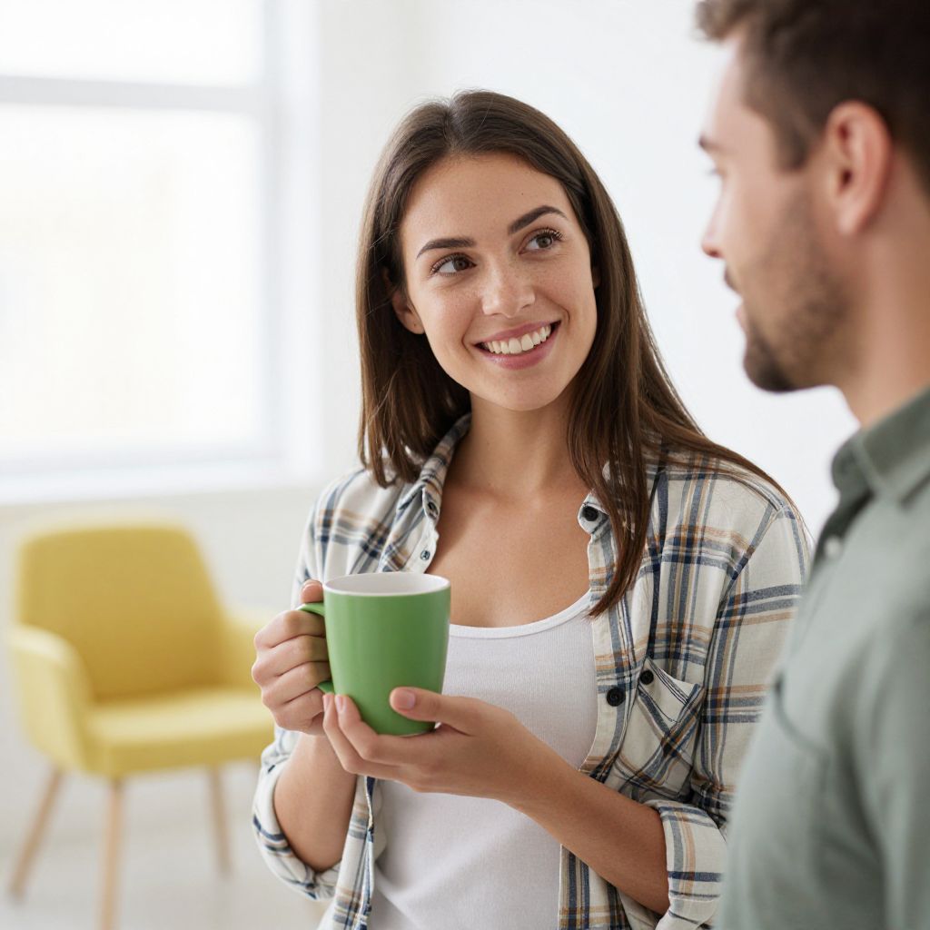 Photograph of a smiling young woman with long brown hair, wearing a white tank top and plaid shirt, holding a green mug with both hands. She is facing a man with short brown hair and a beard, who is partially out of focus in the foreground. The background is bright and blurry, featuring a yellow chair. The woman's skin is fair, and she has an engaging, friendly expression. The image has a light, airy feel with a focus on the woman's cheerful demeanor and the casual, everyday setting.