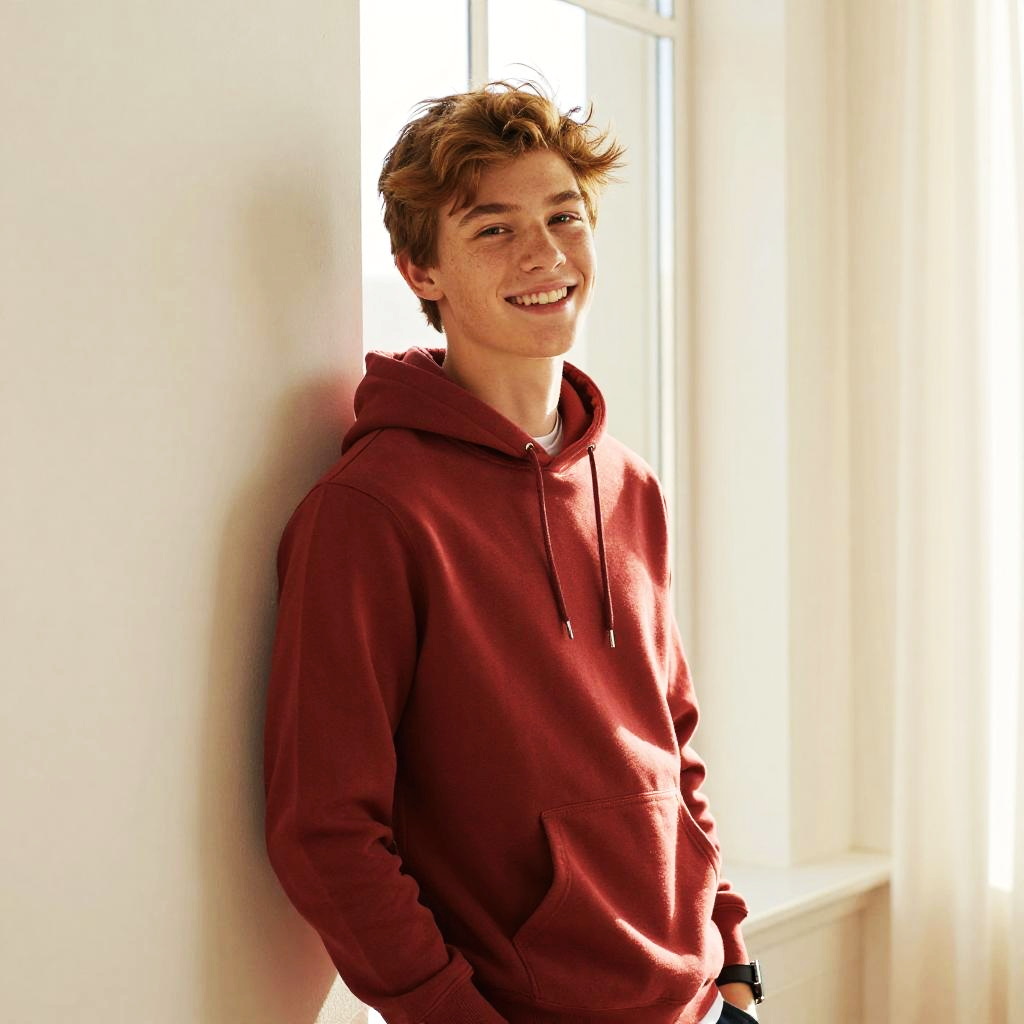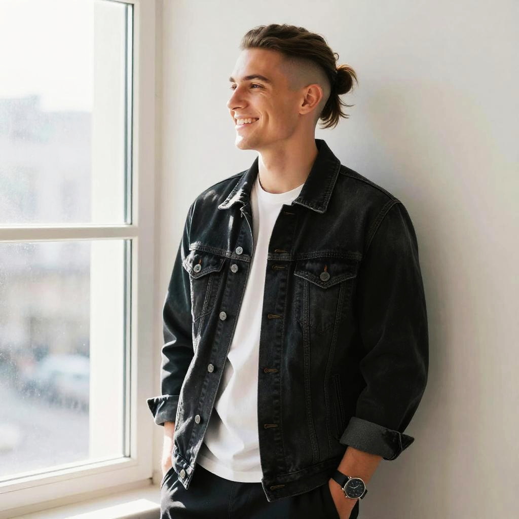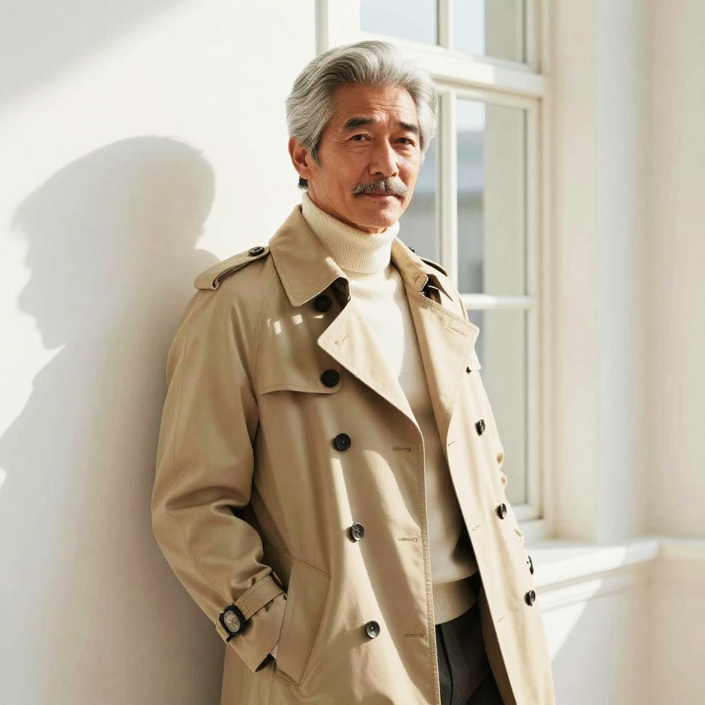 Editorial portrait of serene elderly man with long silvery beard and balding head leaning against a sunlit white wall near a tall window. Wearing a comfortable soft tan cardigan, right hand in pocket, slim black wristwatch on left wrist. Backlit by gentle morning sunlight creating a hazy, nostalgic atmosphere. Airy composition, shallow depth of field, clean background, natural color grading, gentle contrast, creamy bokeh, subtle grain, refined styling, authentic expression.
