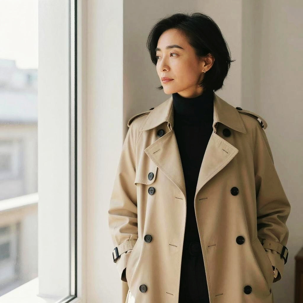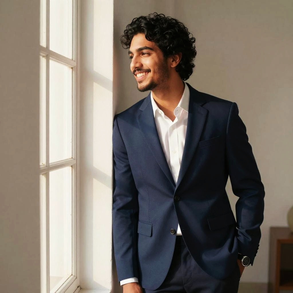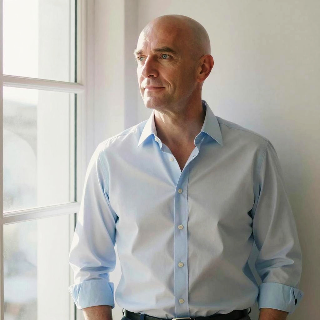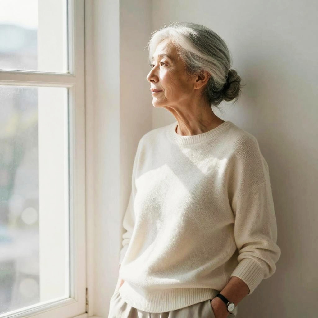 Serene elderly man with a long silvery beard and balding head standing by a tall window. He is wearing a soft tan cardigan over a white shirt, with his right hand in his pocket and a slim black wristwatch on his left wrist. The scene is backlit by gentle morning sunlight, creating a hazy and nostalgic atmosphere with a creamy bokeh and natural color grading.
