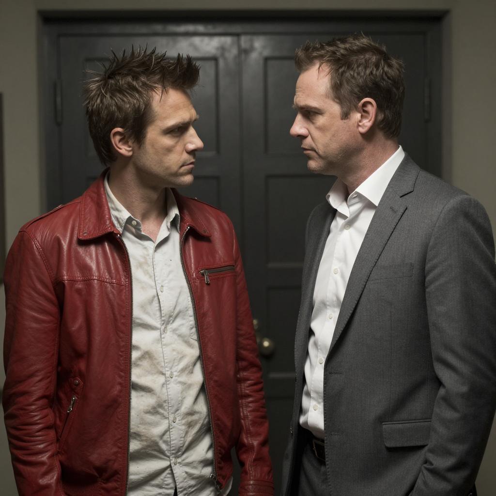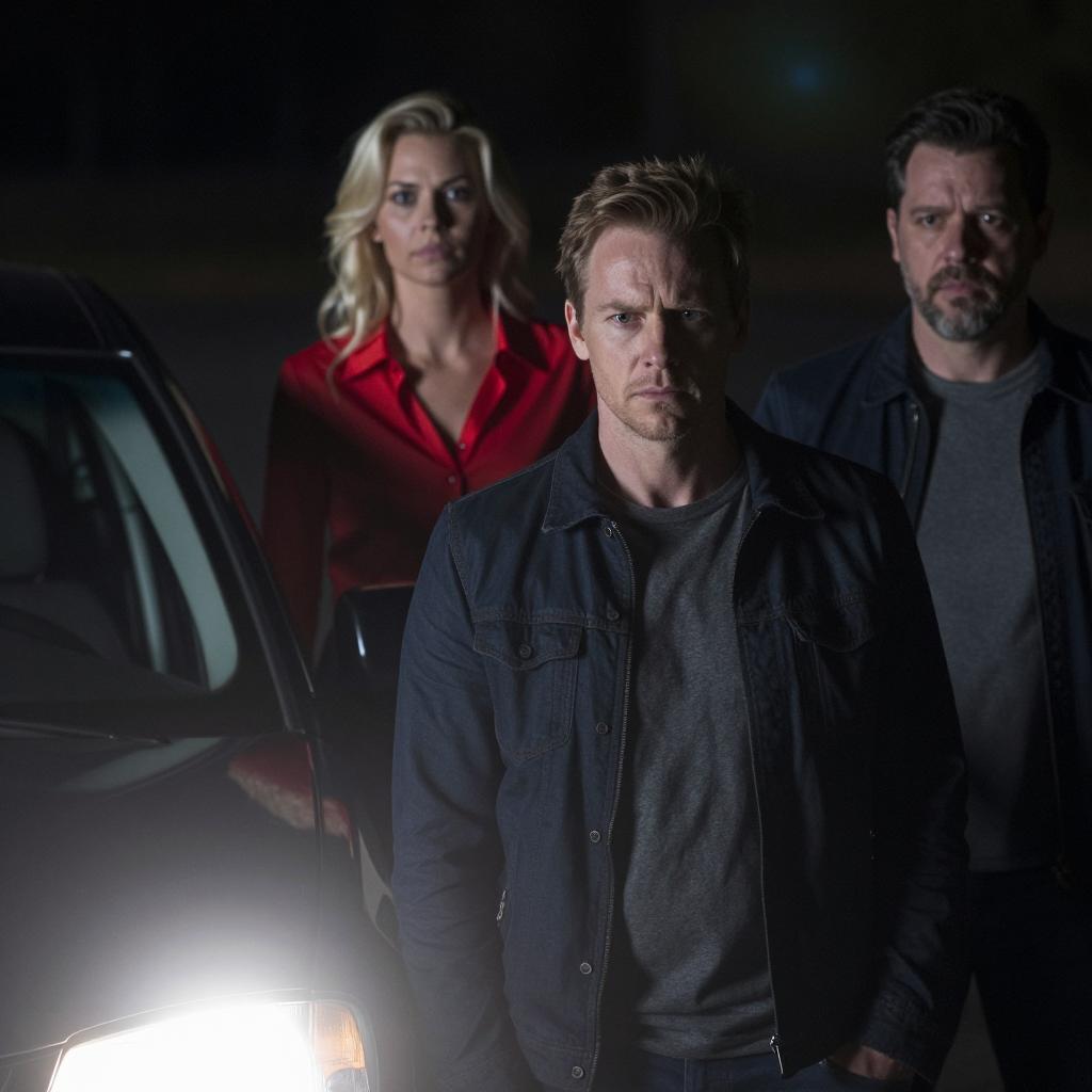 Photograph of three adults standing near a car in dim lighting. A blonde woman in a red button-up shirt stands in the center background with a serious expression. In the center foreground, a man with light brown hair and a stern expression wears a dark jacket over a gray shirt. To the right foreground, a man with dark hair and a short beard wears a dark jacket over a gray shirt with a concerned look. Bright car headlights illuminate the scene from the left, with a smoky or foggy atmosphere and a dark background.