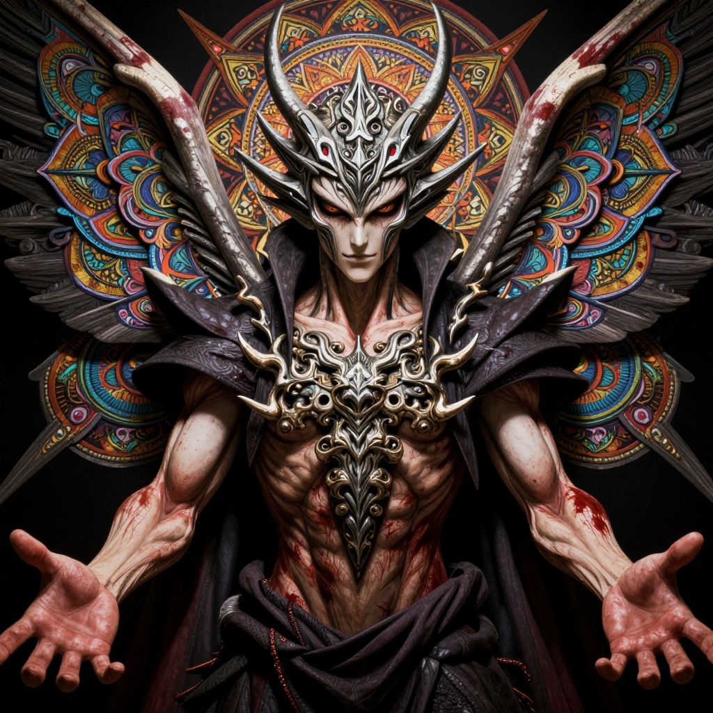 8 k headshot portrait of demonic man with golden teeth with defined arms and open hands and bloody clothes with giant mandala wings, intricate face, flawless anime cel animation by kentaro miura, psychedelic, highly detailed upper body, professionally post - processed, beautiful, scary, symmetry accurate features, epic
