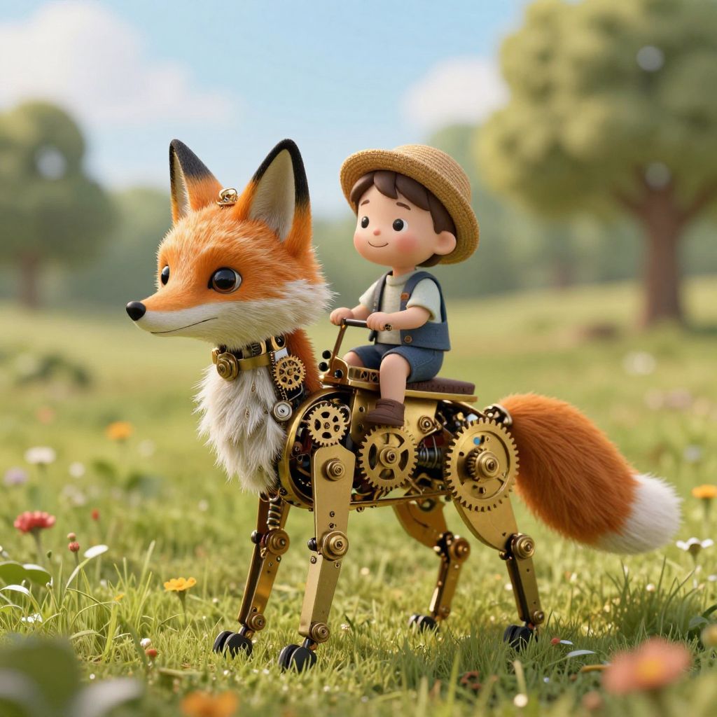 A digital CGI image depicting a cute, smiling cartoon boy with brown hair and a straw hat, wearing a blue shirt and brown shorts, riding a mechanical fox. The fox has vibrant orange fur, black ears, and white chest, with intricate brass gears and cogs on its body. The background is a sunlit, green meadow with blurred trees and colorful wildflowers. The boy holds the fox's reins, and the scene has a whimsical, fantasy-like charm. The image has a soft, realistic texture with a bright, cheerful ambiance.