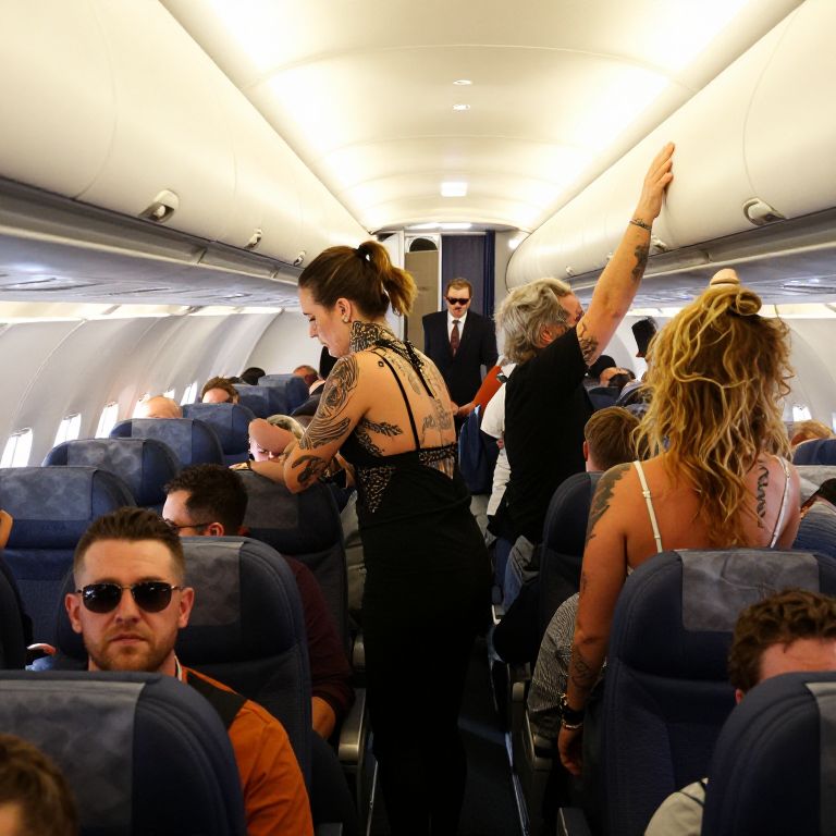 Craggy inside the cabin of a crowded jetsar flight full of tatooed australian tourists in singlet tops and frazzled flight attendants,