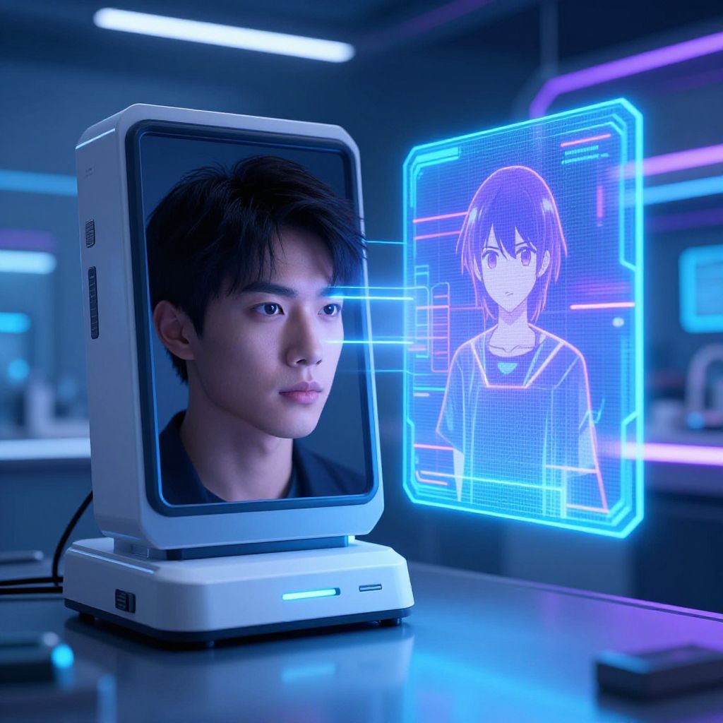 Anime character generator from photo, futuristic device scanning a human face and converting it into an anime character hologram, neon lights, glowing grid patterns, high-tech laboratory with sleek metallic surfaces, cool blue and purple tones, immersive digital environment
