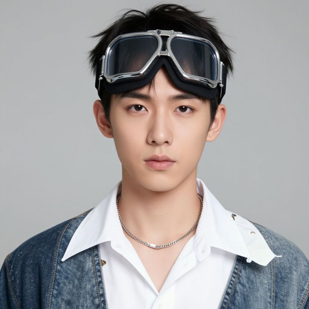 Photograph of a young Asian man with short, black, slightly messy hair, wearing large black aviator goggles on his forehead. He has a neutral expression, fair skin, and dark, almond-shaped eyes. He is dressed in a white collared shirt with a denim jacket over it, and a thin silver chain necklace. The background is a plain, light gray, keeping the focus on the subject. The overall style is modern and casual.