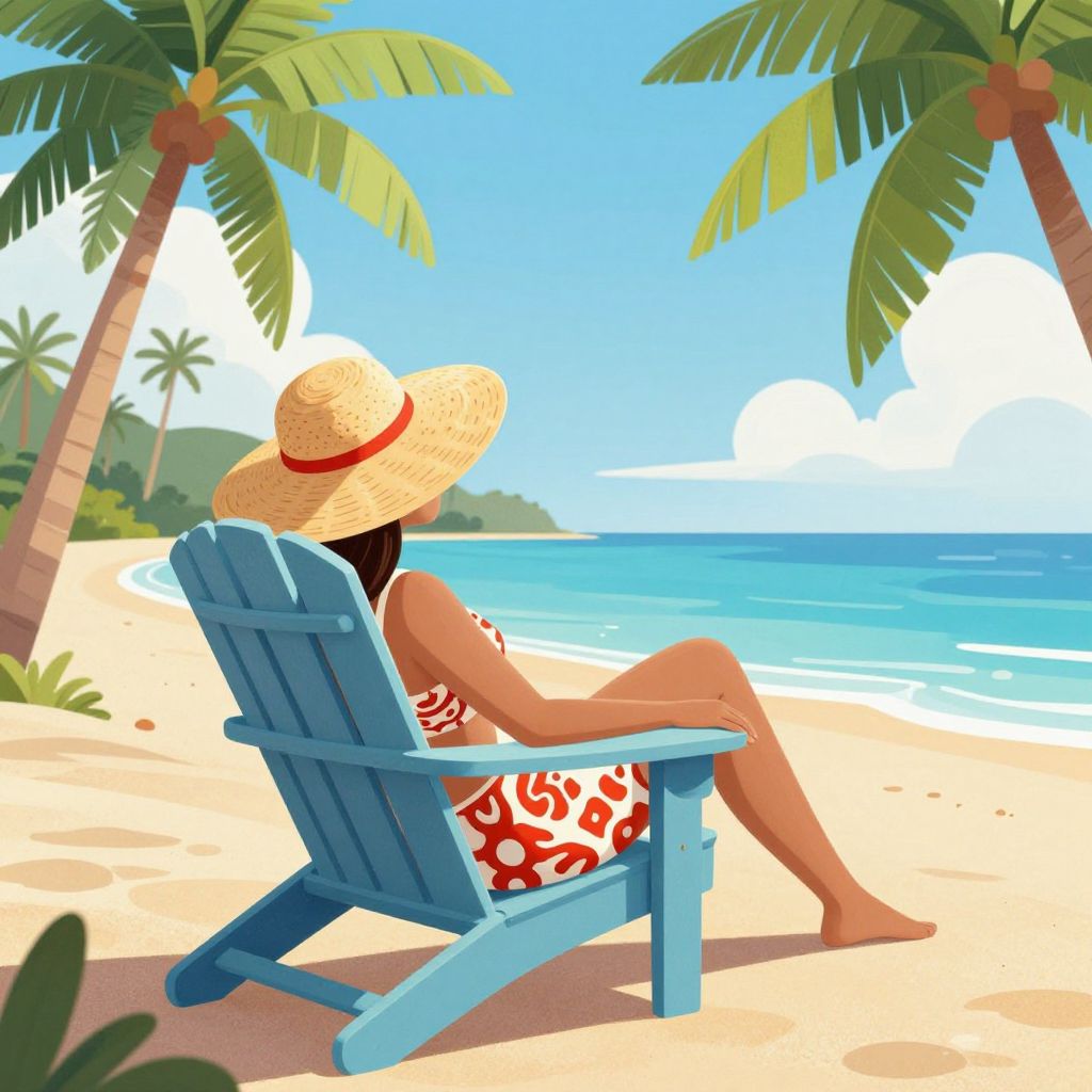 Digital artwork of a woman in a red floral swimsuit and straw hat, relaxing on a blue Adirondack chair on a sunny tropical beach with