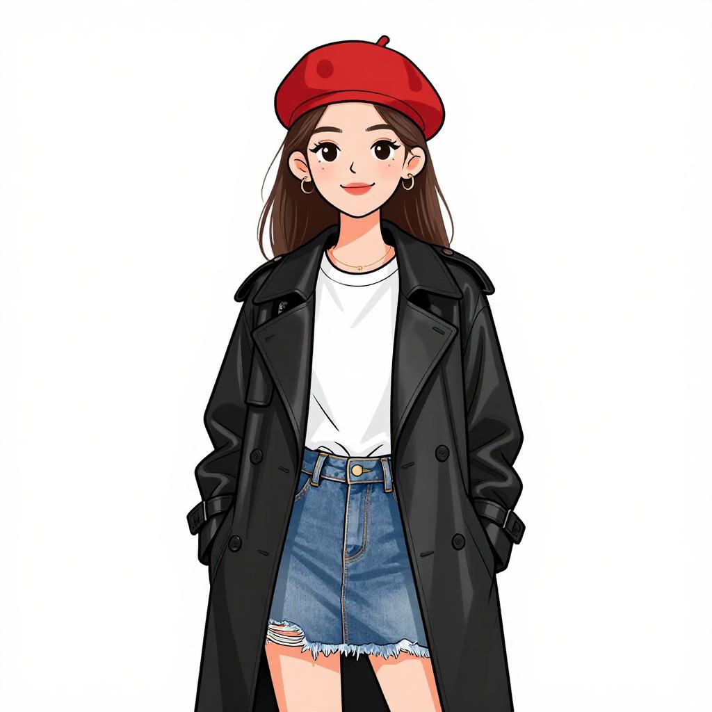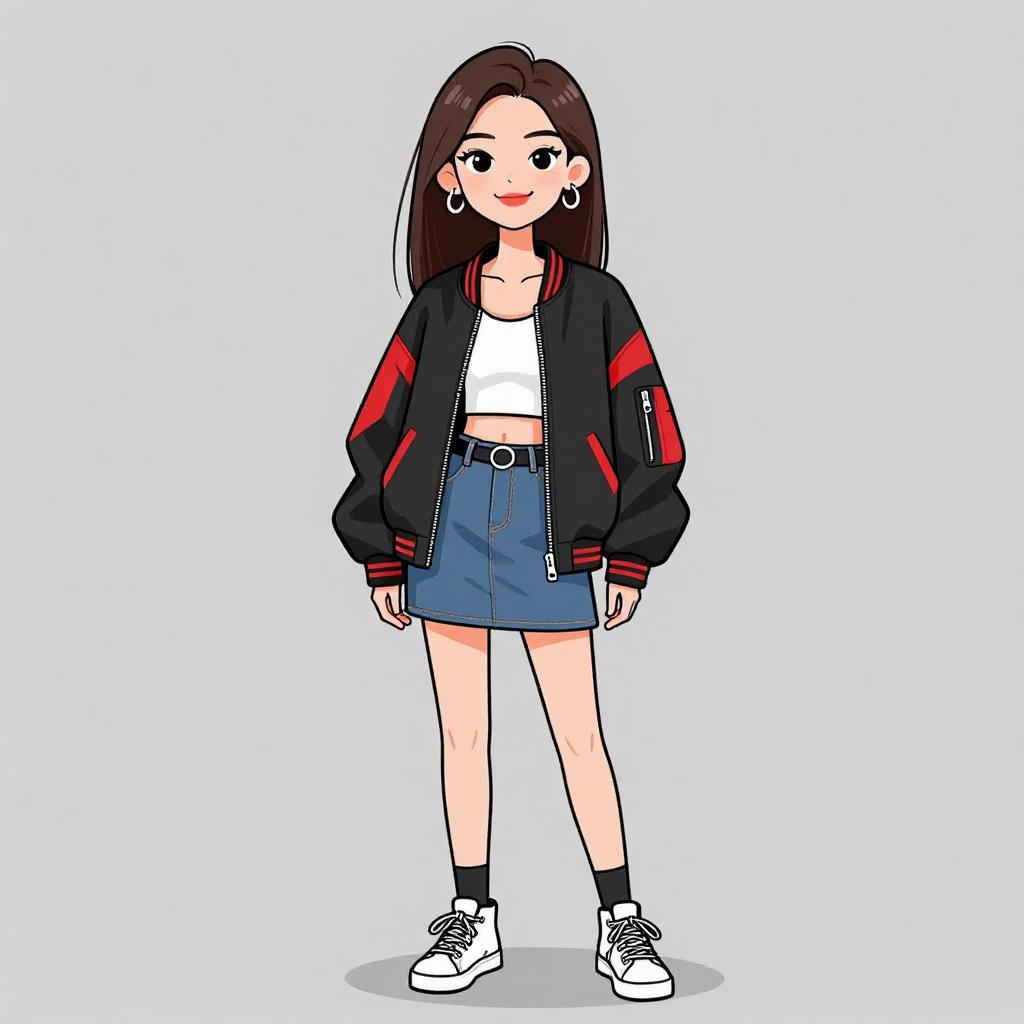 Woman with pretty face and pretty hair. smiling Woman, casual urban streetwear, red bomber jacket, black ribbed cuff and hem, zipped front, black hoodie underneath, black denim mini skirt, ankle-length black leather boots with slight heel, white background with wood flooring --sref 1467