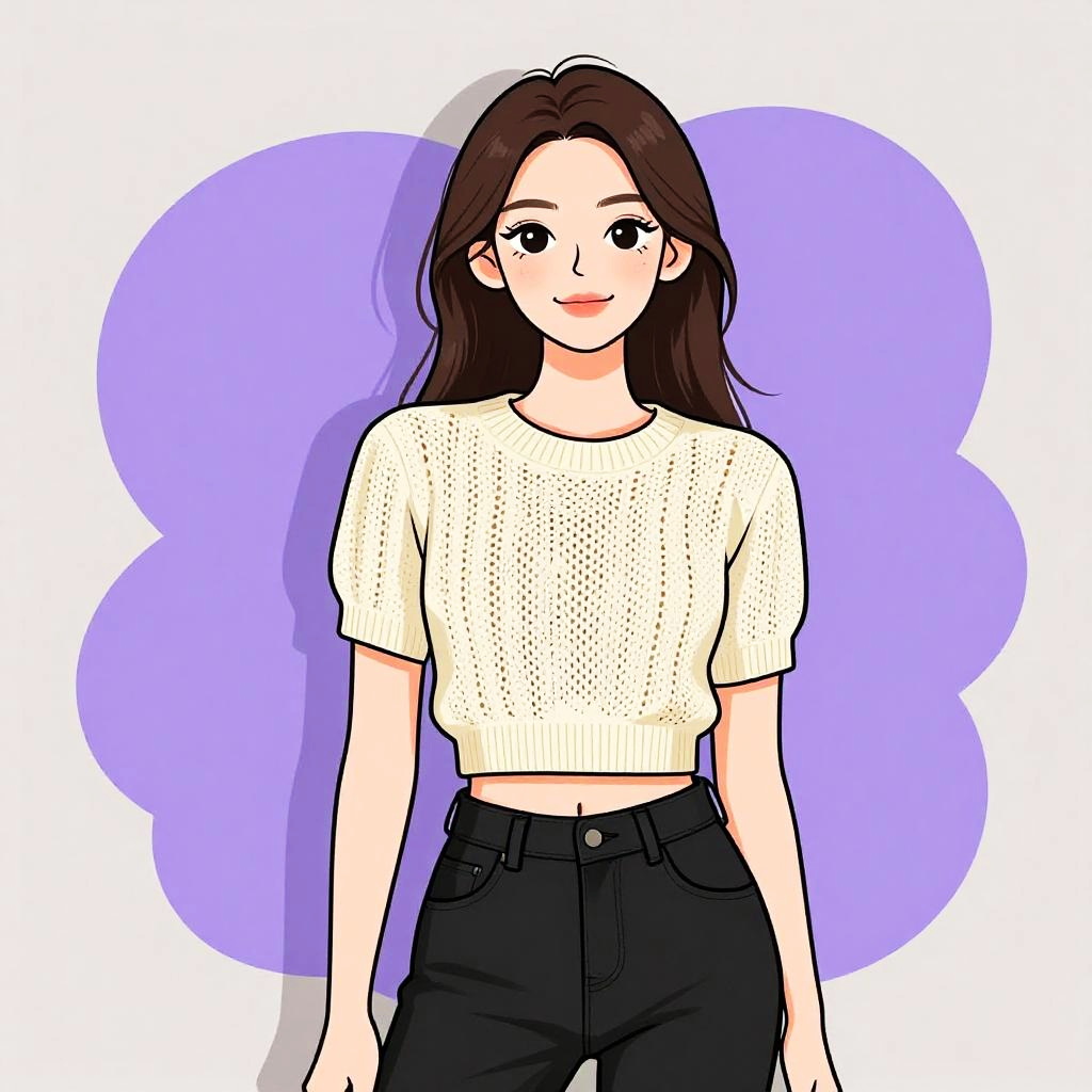 Digital illustration of a young woman with purple hair, wearing a white, short-sleeved, perforated crop top and black high-waisted pants