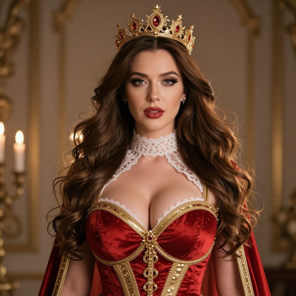 A sexy woman with big tits stands proudly with a golden crown on her head, wearing a magnificent red and gold dress with a delicate white collar, her long flowing hair cascading over her shoulders, glowing under soft candlelight, the atmosphere elegant and mystical, with a hint of fantasy and power, her eyes sparkling with confidence and allure.