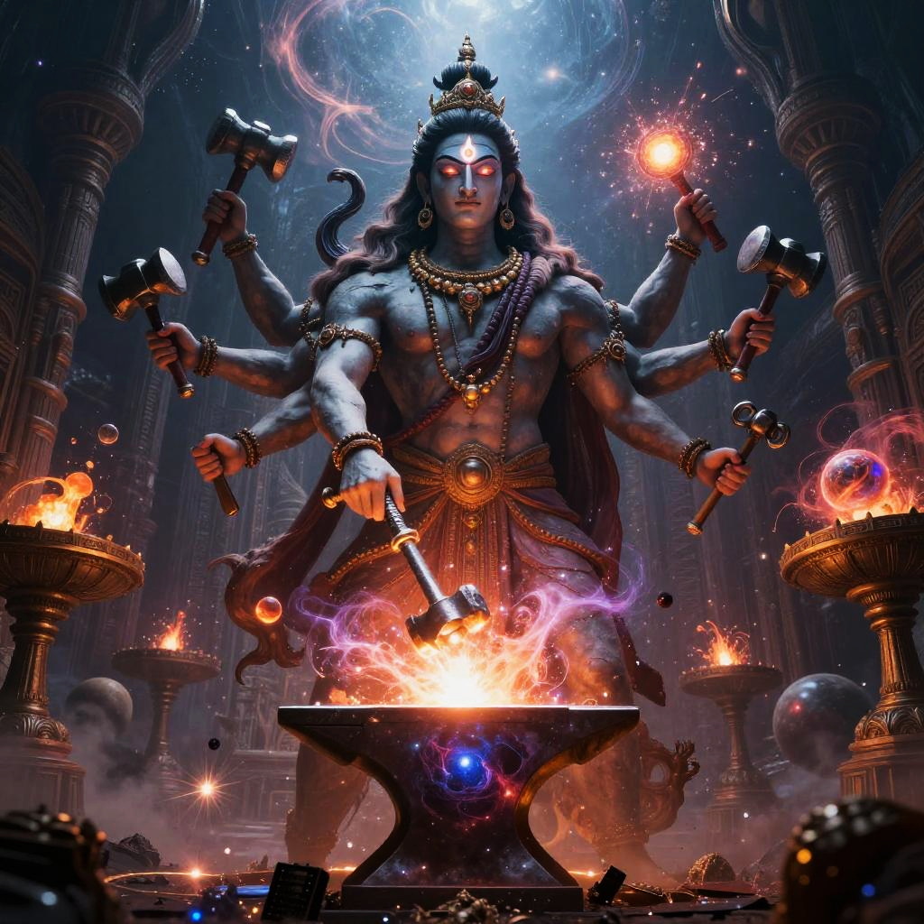 Shiva – The destroyer and god of transformation, shown as a cosmic-smith Shiva, multiple arms wielding glowing hammers and tongs as he forges newborn stars on an anvil of nebulae, eyes like pulsars and a cloak woven from comet tails, standing in a vast stellar forge — an immense cathedral of incandescent nebulae, orbiting anvils and streams of molten starlight where planets cool into being