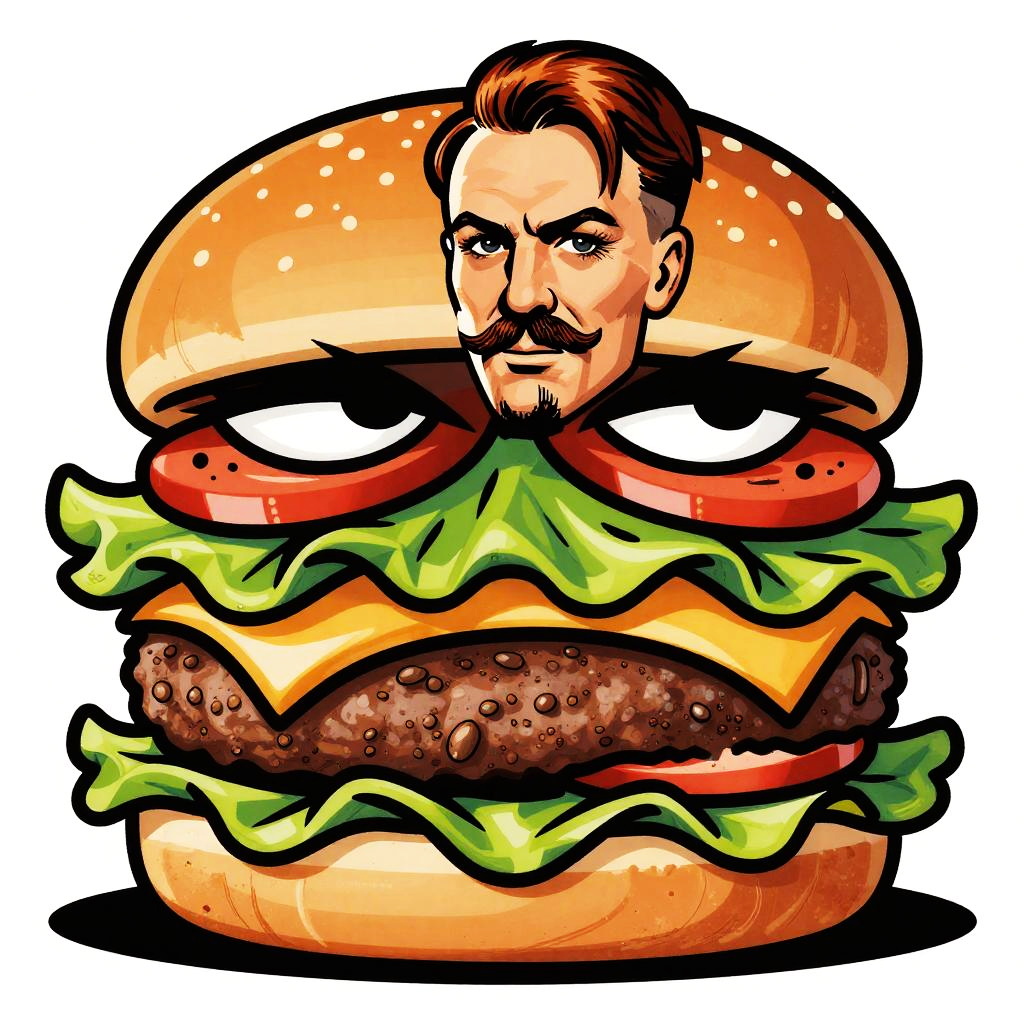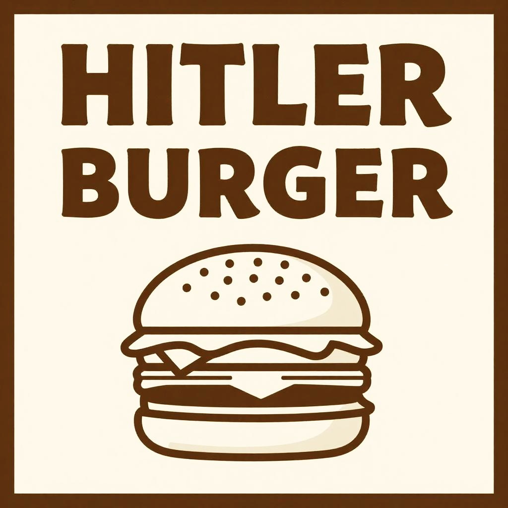 Hitler burger in a dystopian cafe setting, cyberpunk aesthetics with neon lights, gritty textures, and a burger styled with subtle historical references, cinematic lighting