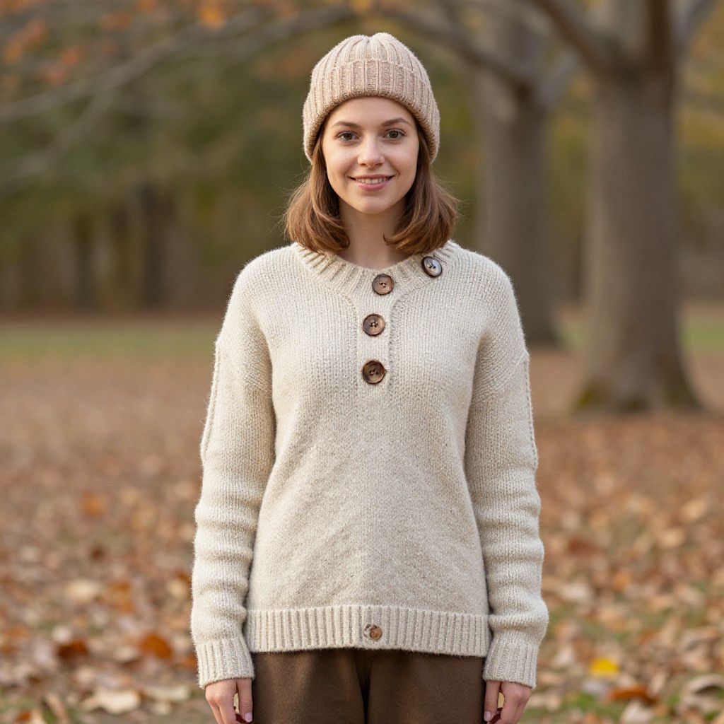 Photograph of a young woman standing in a forest during autumn. She has light skin, brown shoulder-length hair, and is smiling gently. She wears a beige knitted beanie, cream-colored knitted sweater with large brown buttons, and dark brown pants. The background shows a blurred forest with trees and a ground covered in fallen orange and brown leaves. The woman's sweater has a textured, cozy appearance, and the overall scene has a warm, seasonal feel. The lighting is soft, enhancing the autumnal colors.