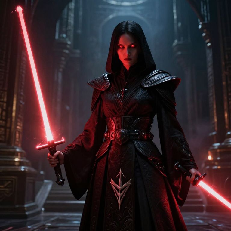 Photograph-style digital artwork of a dark-haired woman in a medieval fantasy setting, holding two glowing red lightsabers. She wears a black, intricately patterned robe with silver shoulder armor, cinched at the waist with a belt. Her expression is serious, with red glowing eyes. The background features a dark, misty, grandiose hall with tall archways and columns. The scene is illuminated by the red lightsabers, creating a dramatic, otherworldly atmosphere. The image combines elements of science fiction and fantasy, with a strong focus on the character's powerful, enigmatic presence.
