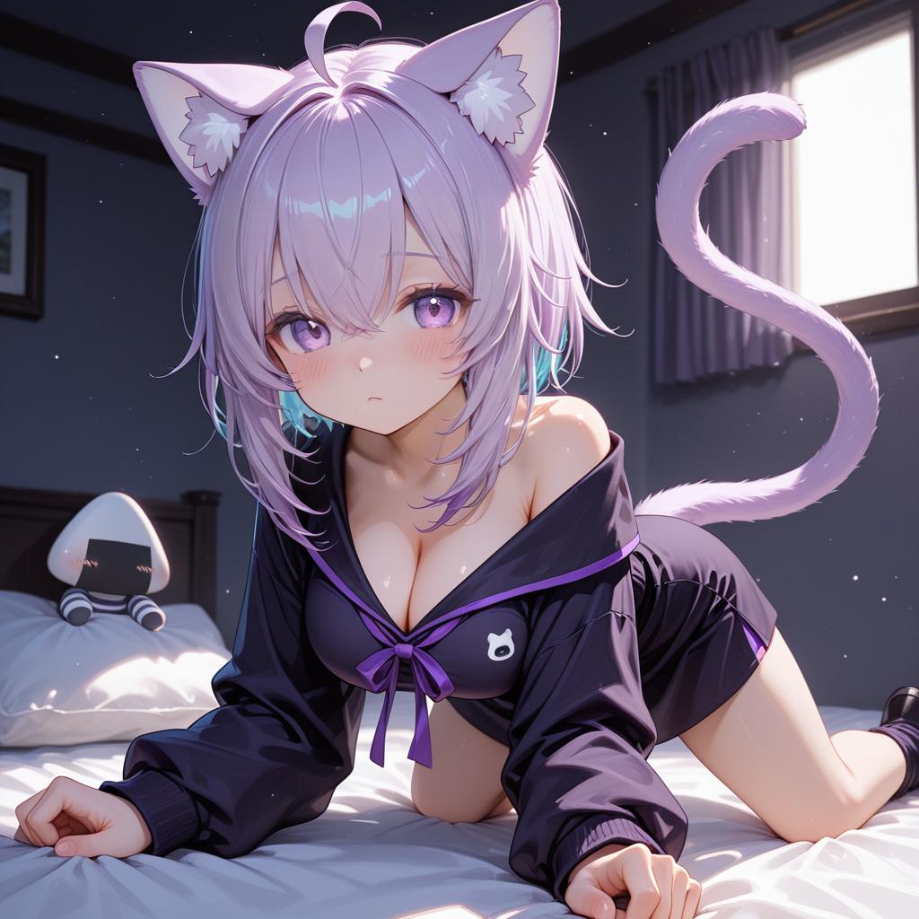 Onigirya (nekomata okayu), hololive, 1girl, cat girl, cat ears, animal ear fluff, cat tail, purple eyes, hair between eyes, purple hair, short hair, medium hair, ahoge, crossed bangs, large breasts, cleavage, long sleeves, virtual youtuber, virtual youtuber, by artist omutatsu, animagine