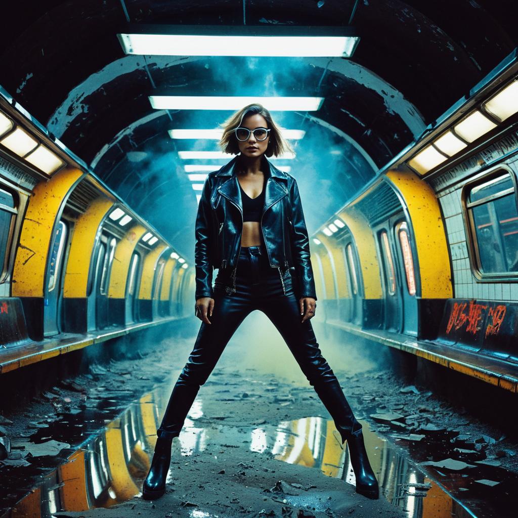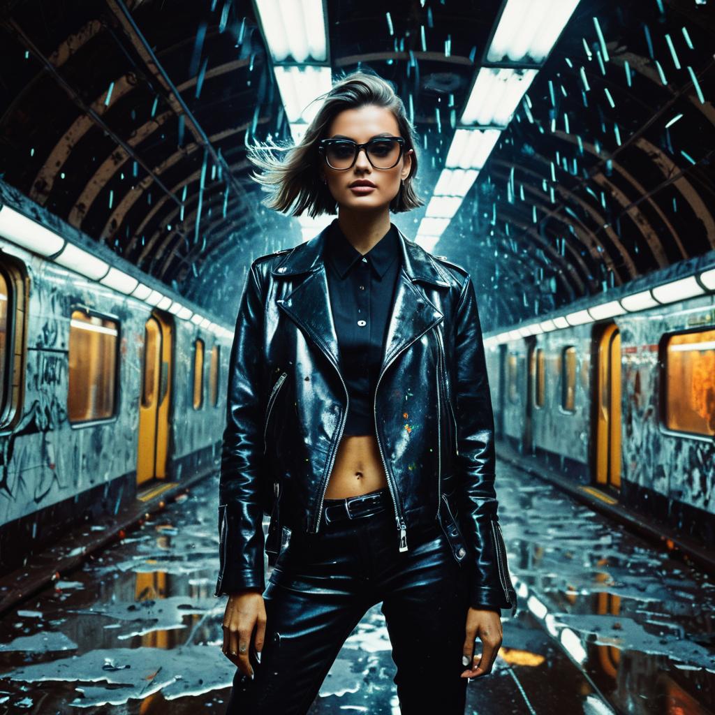Dramatic high-fashion editorial set in abandoned neon-lit subway station, showcasing a fierce model clad in tailored leather jacket and avant-garde glasses, enveloped by vivid reflections and drifting dust particles illuminated by stark fluorescent lights, rendered as an intricate oil painting with multiple exposure, Vogue cover style, cinematic lighting by Stanley Kubrick and Greg Rutkowski.