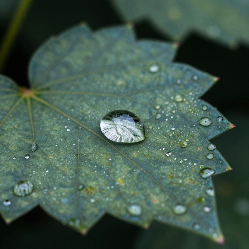 Piercing filter effect in a macro shot of a raindrop on a leaf, light piercing through the droplet, highlighting intricate surface textures, shallow depth of field, natural greens and blues blending with sparkling highlights, serene and hyper-real nature close-up.