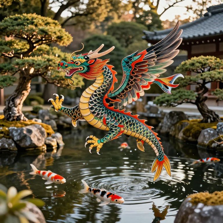 A vibrant, digital illustration of a colorful, dragon-like creature with green, blue, and red scales, large feathered wings, and sharp claws, leaping out of a serene Japanese-style garden pond. The dragon, with a fierce expression and open mouth, creates ripples in the water. Below, several orange and white koi fish swim. The background features traditional Japanese architecture, with a dark roof and lush trees, and rocks surrounding the pond. The image is rich in detail and texture, with a focus on the dragon's dynamic pose and vivid colors, set against the tranquil garden setting.